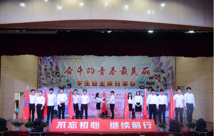 来自校学生会及各二级学院的学生会主席们分别通过主题演讲、朗诵、群口相声、情景剧、现场访谈等形式,从学生会的工作、学生活动组织、学生干部学习、社会实践、情感等方面进行了经验分享和成果总结,表达了作为一名学生会主席的骄傲和责任,作为一名青年学生,应该珍惜青春,珍惜新时代,做新时代的奋斗者!第十六届学生干部把象征着责任与义务的大旗交给了下一届优秀学员,授旗仪式结束后进行了颁奖。