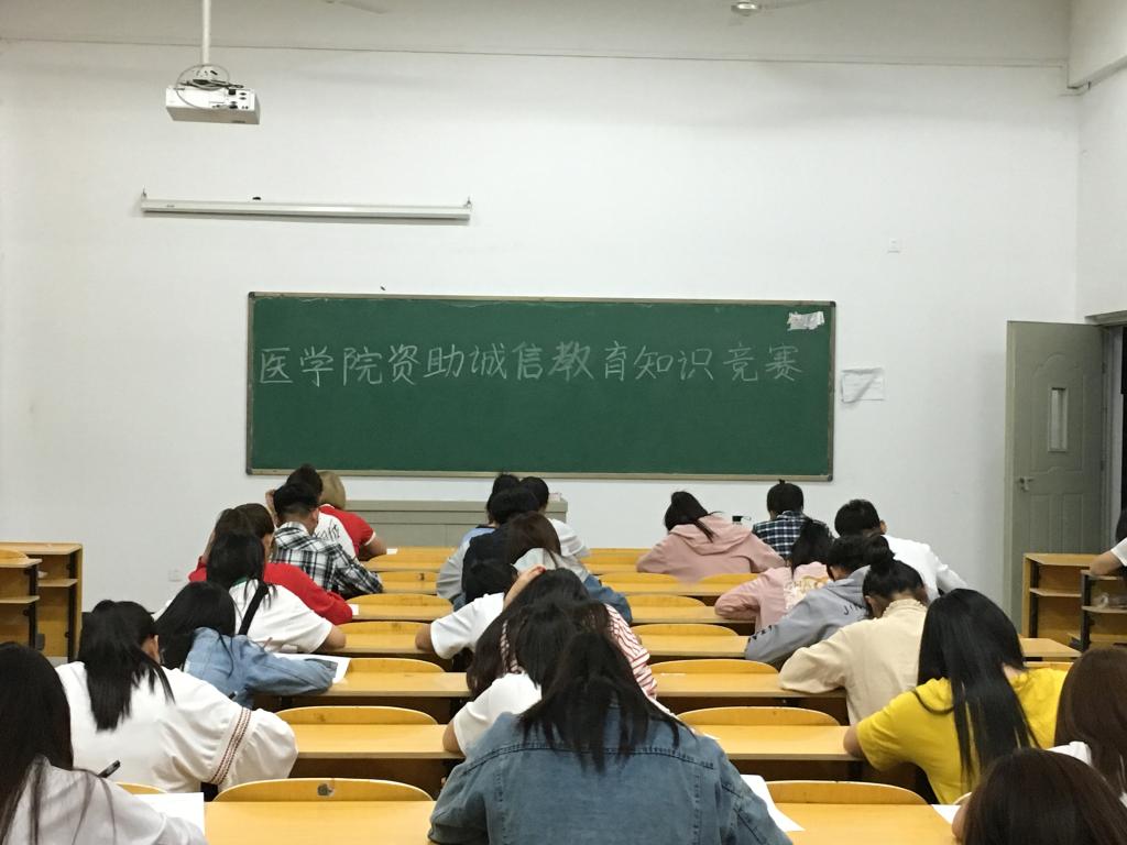 为深入宣传国家资助政策,进一步加大学生资助政策宣传力度,增强大学生诚信意识,强化资助育人效果,5月9日晚7点30分,医学院在D106教室组织资助诚信教育知识竞赛,在班级择优推荐的基础上,共有55名资助学生参加竞赛。