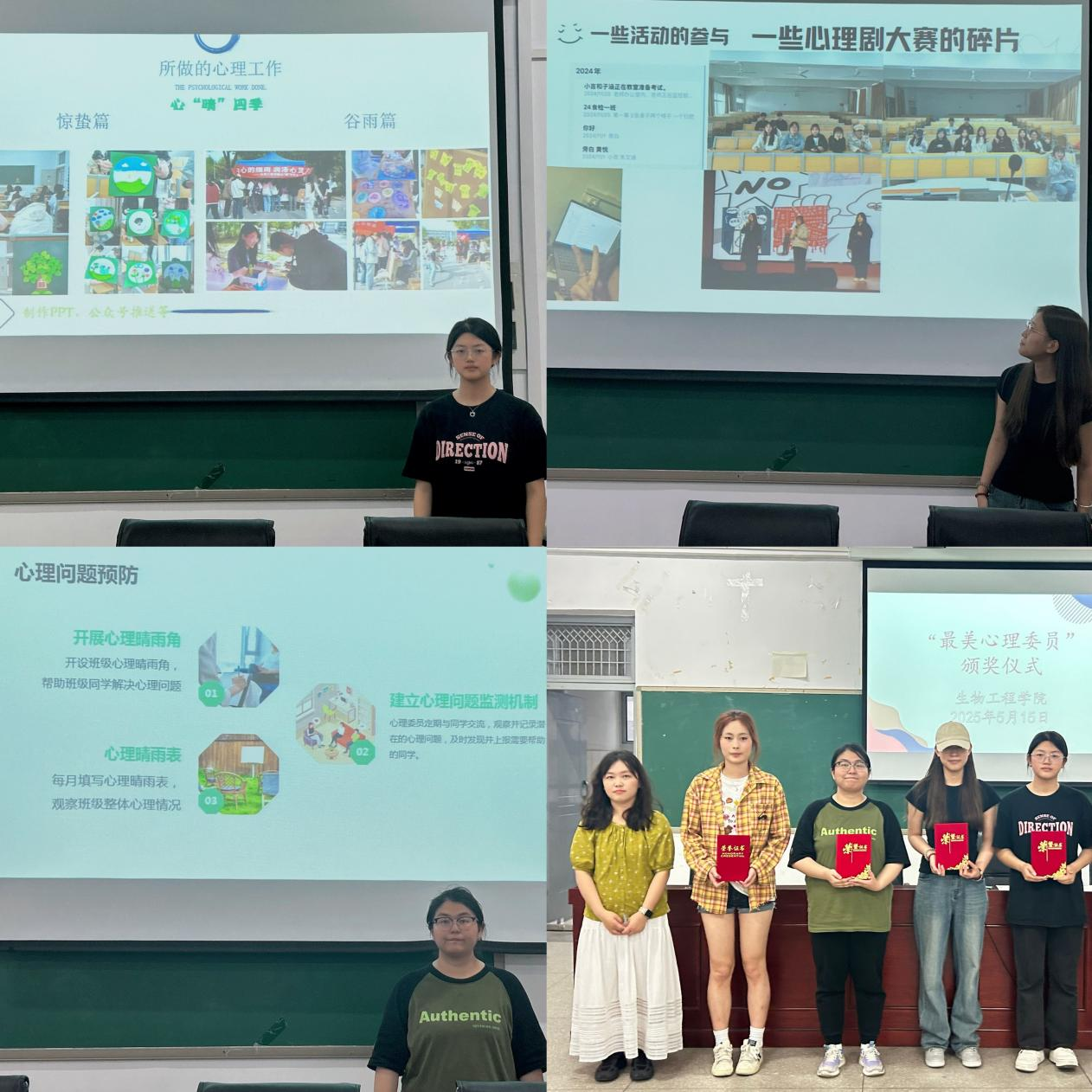此次“最美心理委员”评选暨心理活动颁奖仪式,通过树榜样、展成果、促提升,既是对过往心理健康教育工作的总结表彰,亦是对未来的展望规划。生物工程学院将以此为新起点,发挥心理委员作用,创新活动形式,开展特色活动,护航学生成长,让“心晴四季”品牌系列活动为学生心灵成长注入持久动力。(供稿:生物工程学院 汪纬静 初审:周婷 审核:杨璨)