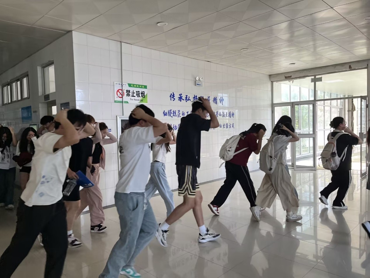 实战模拟:全方面还原避险场景。15时40分,随着警报声响起,演练正式启动。避险阶段:一层教室学生迅速弯腰护头,就近躲避于课桌下方;二层教室学生则按预案形成“三角区”防护姿态,远离玻璃窗和悬挂物。疏散阶段:警报间隔期,学生在辅导员引导下沿预定路线撤离。楼梯转角处,由学生志愿者组成的“安全员”指引方向,提醒“不推挤、不折返”。全体人员迅速完成集结。
