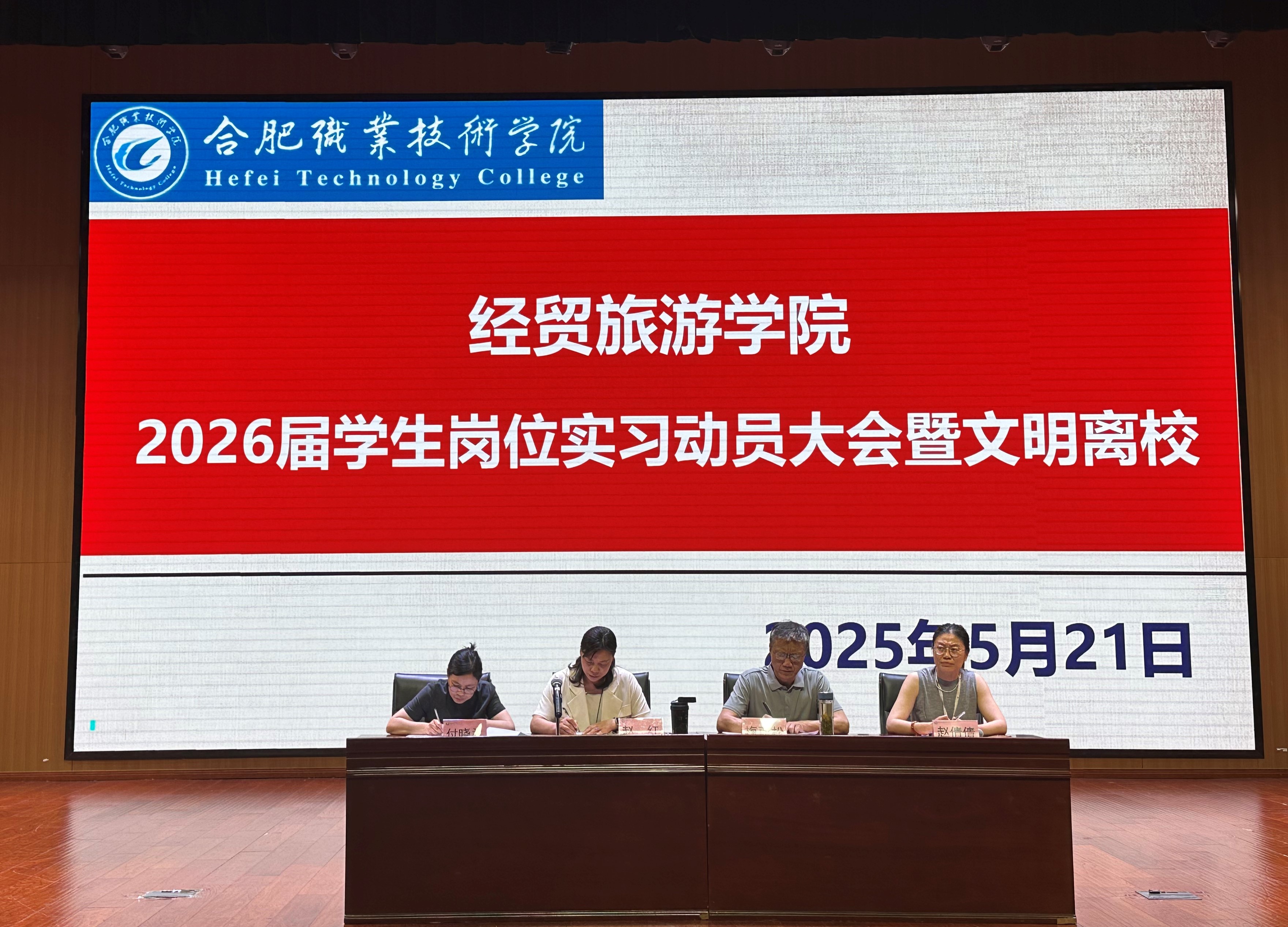 为进一步使学生明确毕业生岗位实习必要性,强化2026届毕业生岗位实习过程管理,扎实推进实习与就业工作方案,促进校企深度合作和高质量就业,5月21日下午,经贸旅游学院在汇心湖校区大学生活动中心礼堂召开2026届学生岗位实习动员大会。该院党总支书记梅亚松、党总支副书记赵倩倩、院长赵红、副院长付晓兰出席会议,会议由赵倩倩主持,教学办、学管办、实习指导教师等人员,全体2026届毕业生参加大会。