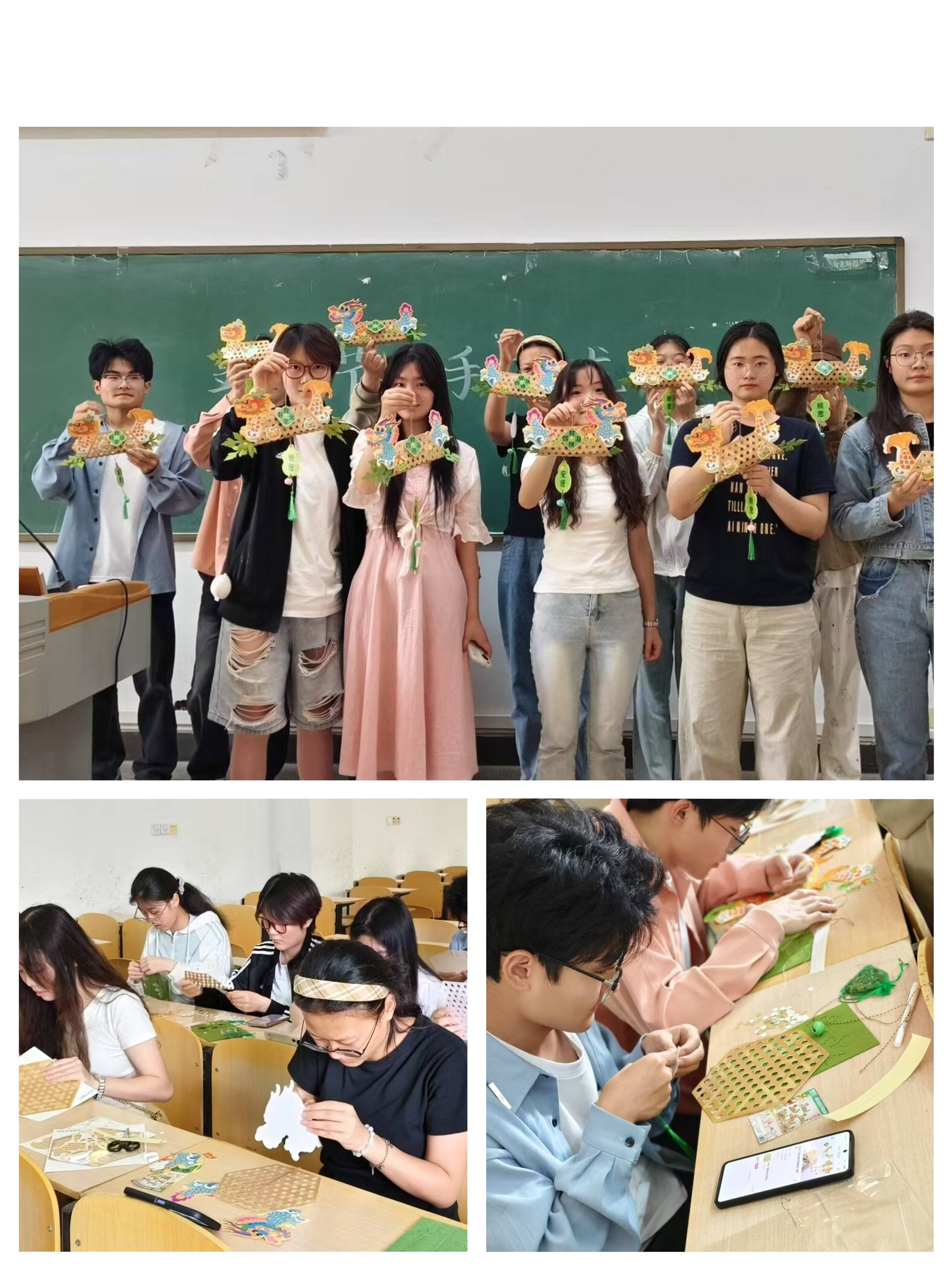 D教学楼里,手工制作龙舟活动同样热闹非凡。在老师的指导下,同学们充分发挥想象力和创造力,利用彩纸、竹签、颜料等材料,精心制作着属于自己的龙舟。有的龙舟造型别致,色彩鲜艳;有的龙舟则注重细节,力求还原真实龙舟的形态。大家互相帮助,共同协作,最终完成了一艘艘充满创意和活力的龙舟作品。