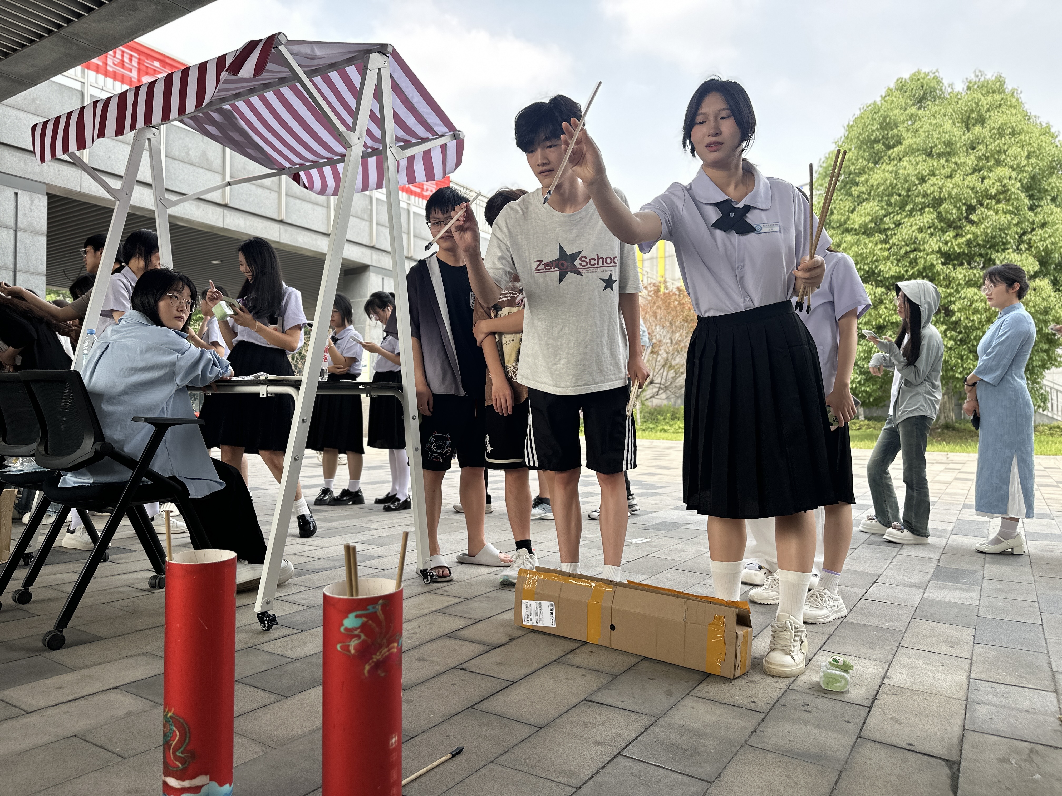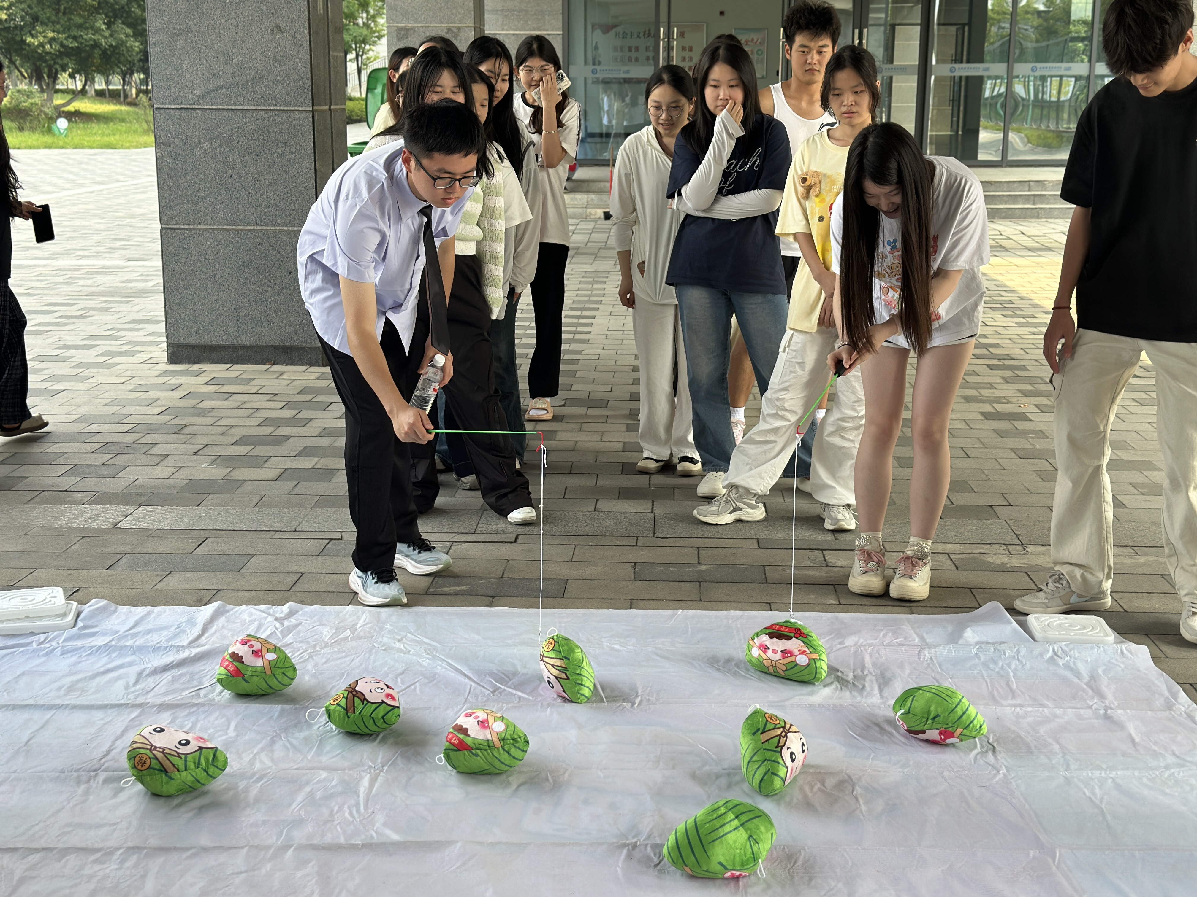 丰富多样的内容让现场热闹非凡,同学们纷纷加入到各个环节中。在极具传统竞技趣味的射五毒和投壶项目前,同学们排起长队,手持粽子玩偶和箭矢瞄准五毒和投壶,在驱灾纳福的传统游戏中展现青春风采。在钓粽子环节,同学们全神贯注挑战一分钟打捞“粽子”,以钓粽子的形式纪念屈原,以便能更深刻地感悟端午文化背后的家国情怀。手工制作区更是人气爆棚,同学们亲手编织五彩绳,将吉祥寓意缠绕于腕间;艾草香囊DIY活动中,大家穿针引线,将健康祝福缝于香囊之中;传统竹编龙舟小船搭配艾叶,满载着平安健康的祝愿。现场欢声笑语不断,既展现了传统节俗的独特魅力,也彰显了伟德官网学子团结协作的精神风貌。