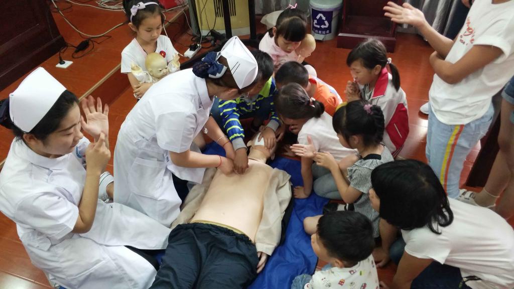 6月2日上午,天使护理社指导教师梁春艳带领心肺复苏梯队培训第一梯队优秀队员谷士宇、王世仲、董德慧和王娇等四人前往岗岭社区实践基地,为社区20多名儿童带来了一堂关于防溺水、心肺复苏的知识讲座,孩子们认真听讲,积极参与各项急救技术的体验,并有效学习了如何营救溺水人员。