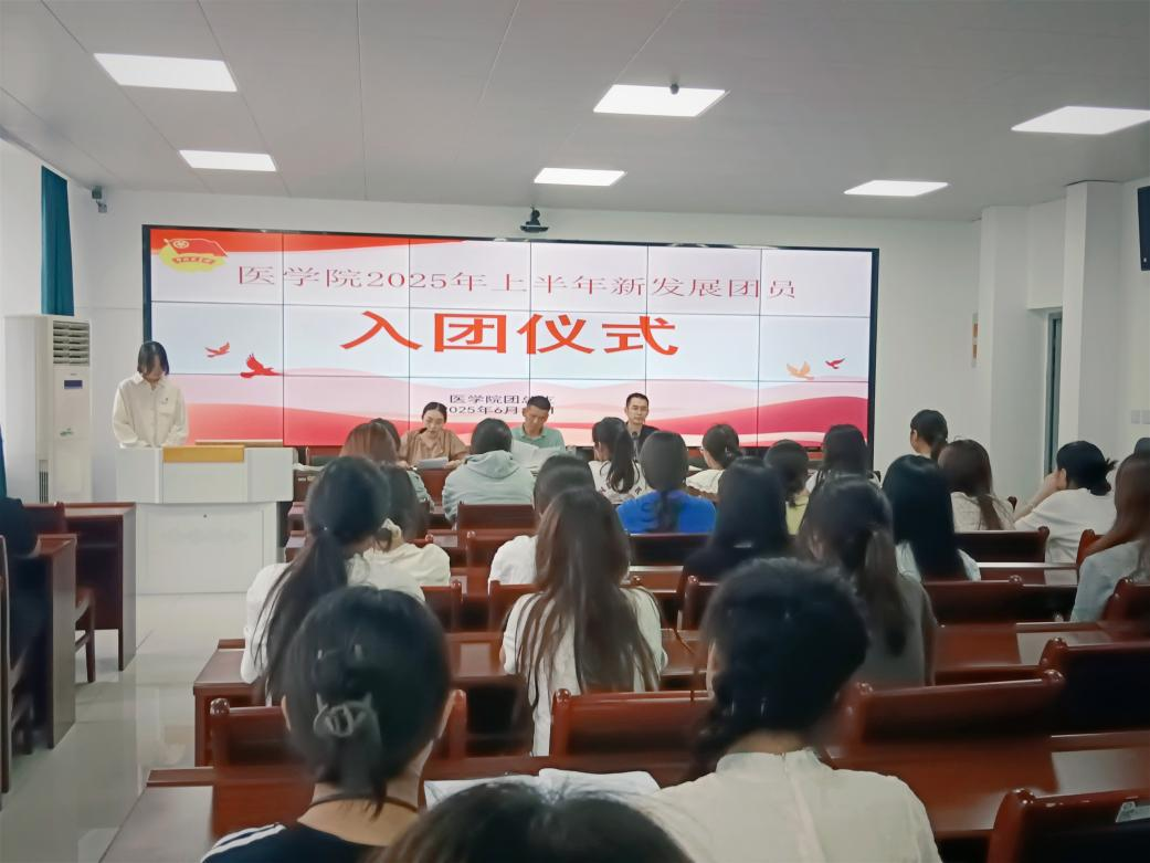 为进一步强化青年思想政治引领,增强共青团组织的凝聚力,激励新时代青年勇担时代使命,6月18日下午,医学院在医学楼大会议室举办2025年上半年新发展团员入团仪式。医学院党总支副书记(主持工作)邹华兵、教师代表以及医学院全体新发展团员共同参加了此次意义非凡的活动,仪式由团总支书记刘惠主持。