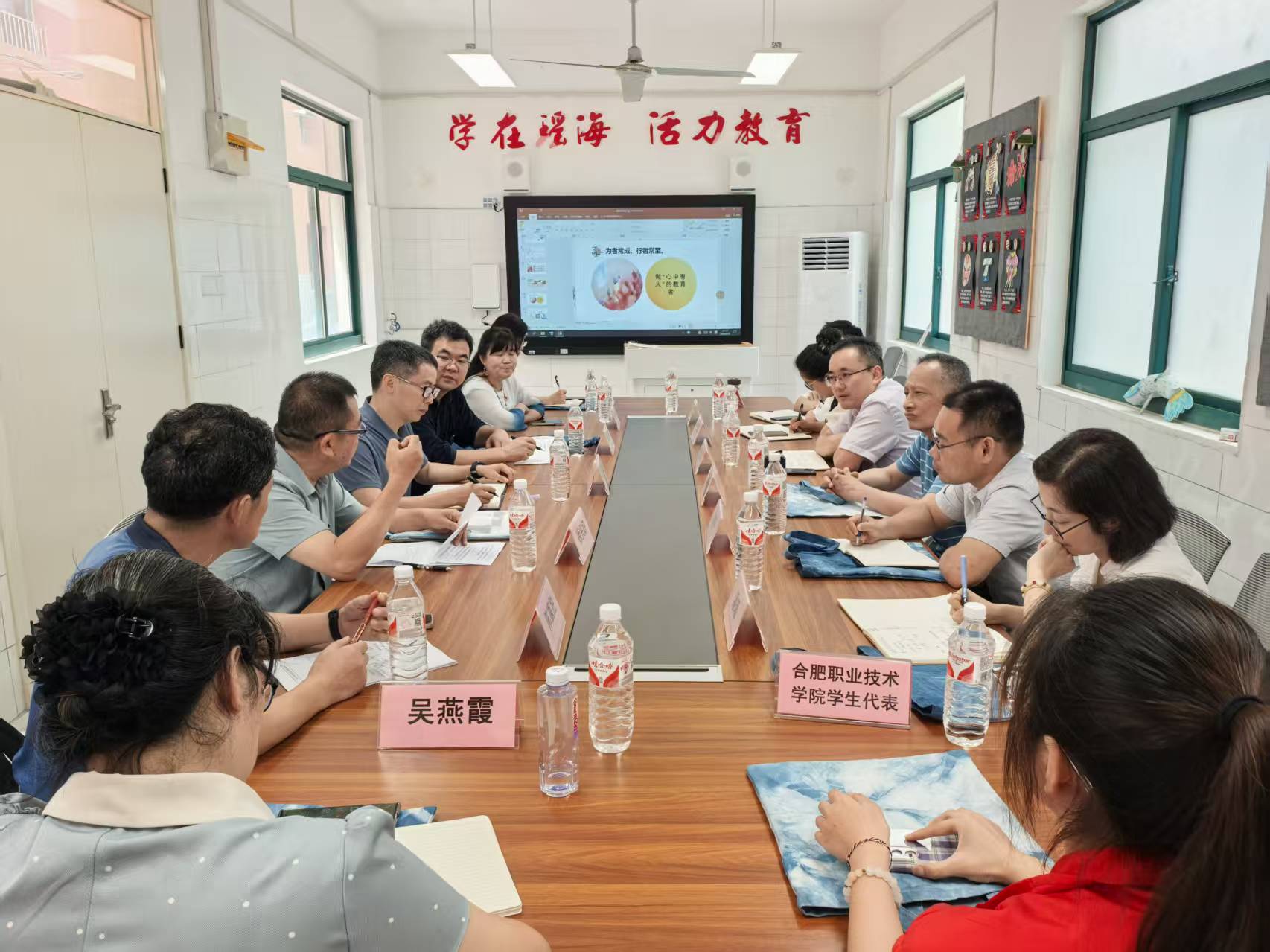 在庆祝建党104周年之际,为探寻党建引领“非遗+思政”育人模式,深入落实合肥市大中小学思政课一体化共同体建设要求,搭建高校与中小学协同育人平台,6月25日,伟德官网马克思主义学院党支部书记王文飞、院长胡心红携4位思政课教师及部分学生代表赴合肥市滁州路小学开展调研。瑶海区教体局机关党总支副书记、组人科副科长罗林东主持活动及会议,瑶海区教体系统“红芯·未来”邓衡名书记工作室主持人邓衡及工作室各成员校党组织书记,合肥市戴萍名师工作室主持人戴萍及工作室成员全程参加会议。