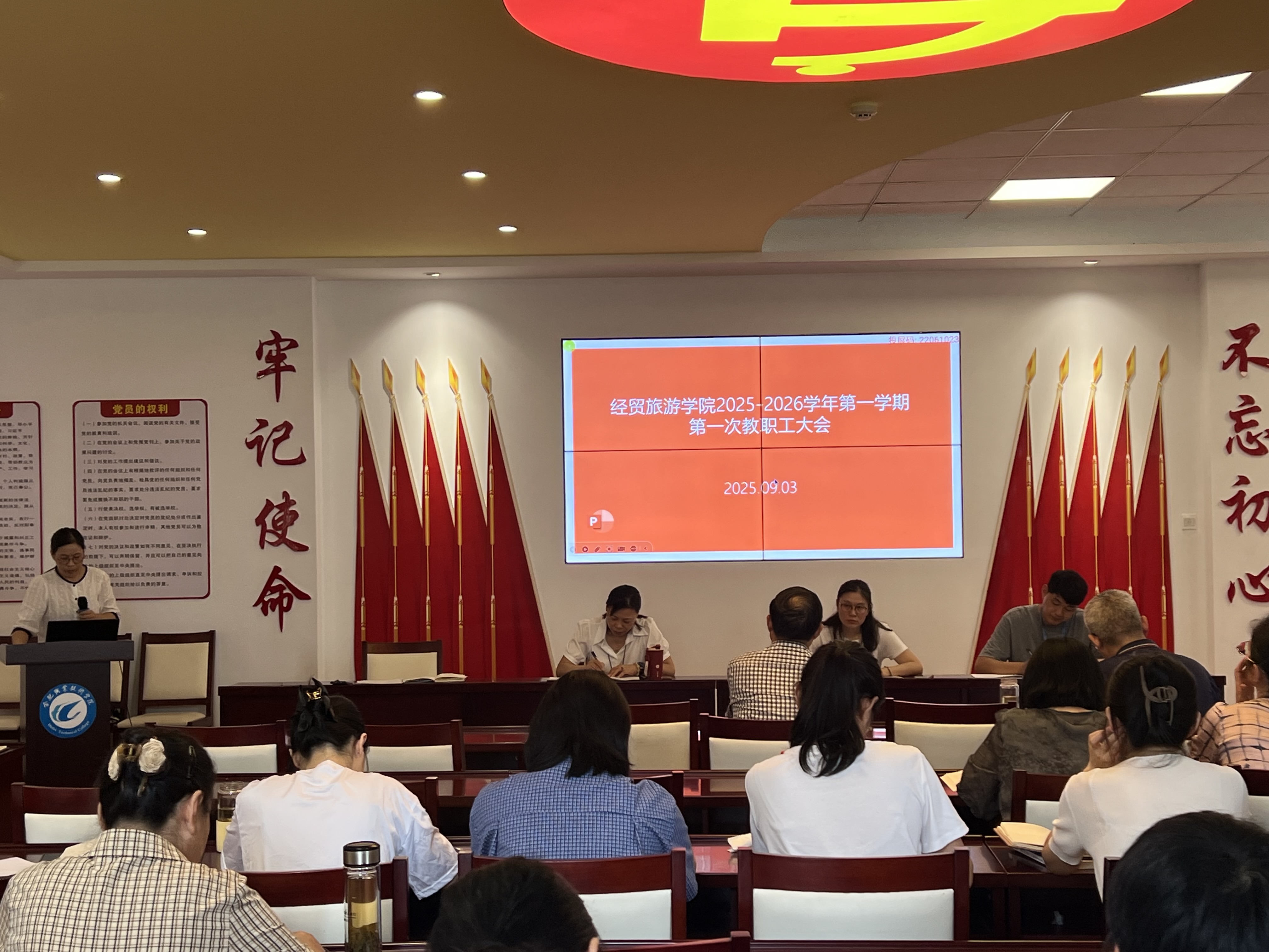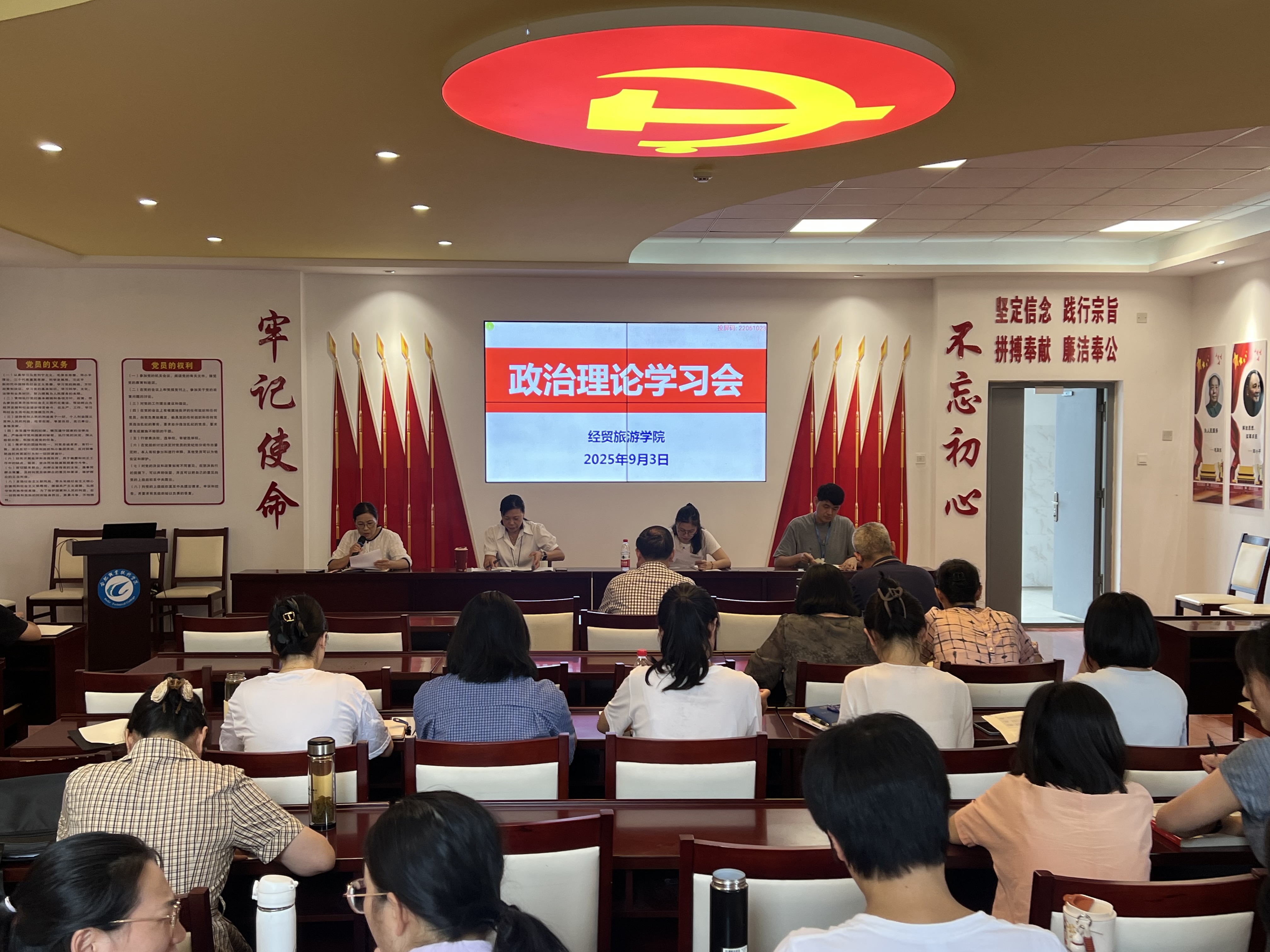 9月3日下午,经贸旅游学院在党性体验馆召开政治理论学习会暨新学期教职工大会,全体教职工参加会议,会议由该院副院长付晓兰主持。