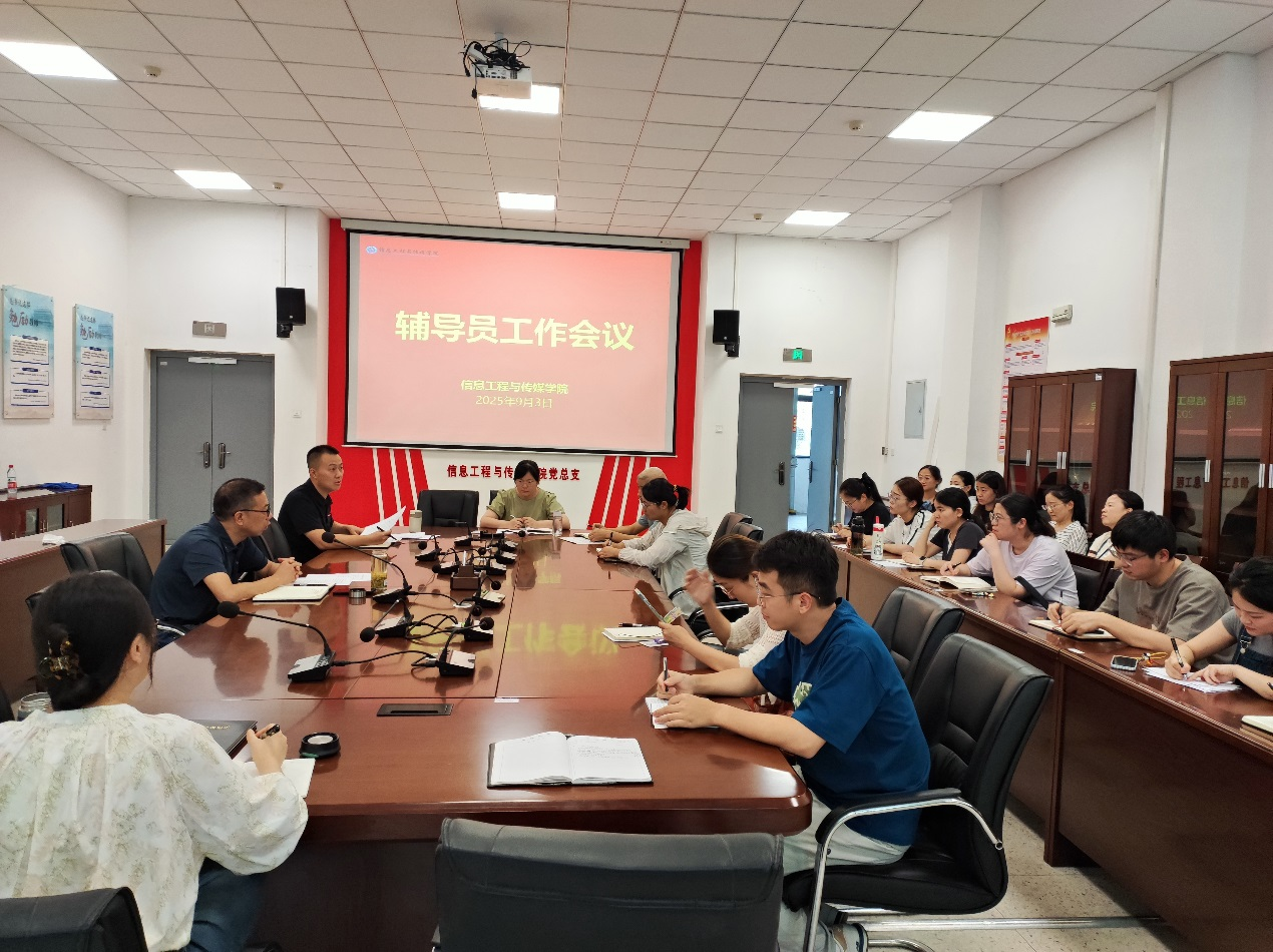 为进一步做好新学期开学工作,安排老生返校和新生入学报到工作,9月3日下午,信息工程与传媒学院在信息楼一楼会议室召开新学期辅导员工作会议,会议由该院党总支副书记江寅昌主持,全体班级辅导员参加此次会议。