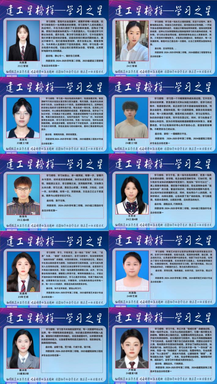 为表彰先进典型,激发学生学习热情,营造“比学赶超”的浓厚氛围,近日,建筑工程学院开展“建工星榜样——学习之星”评选活动,根据2024-2025学年第二学期学业成绩,评选出2023级和2024级各专业总分第一名,共十名优秀学生获得“学习之星”荣誉称号,并于9月8日在教学C楼进行海报展示。