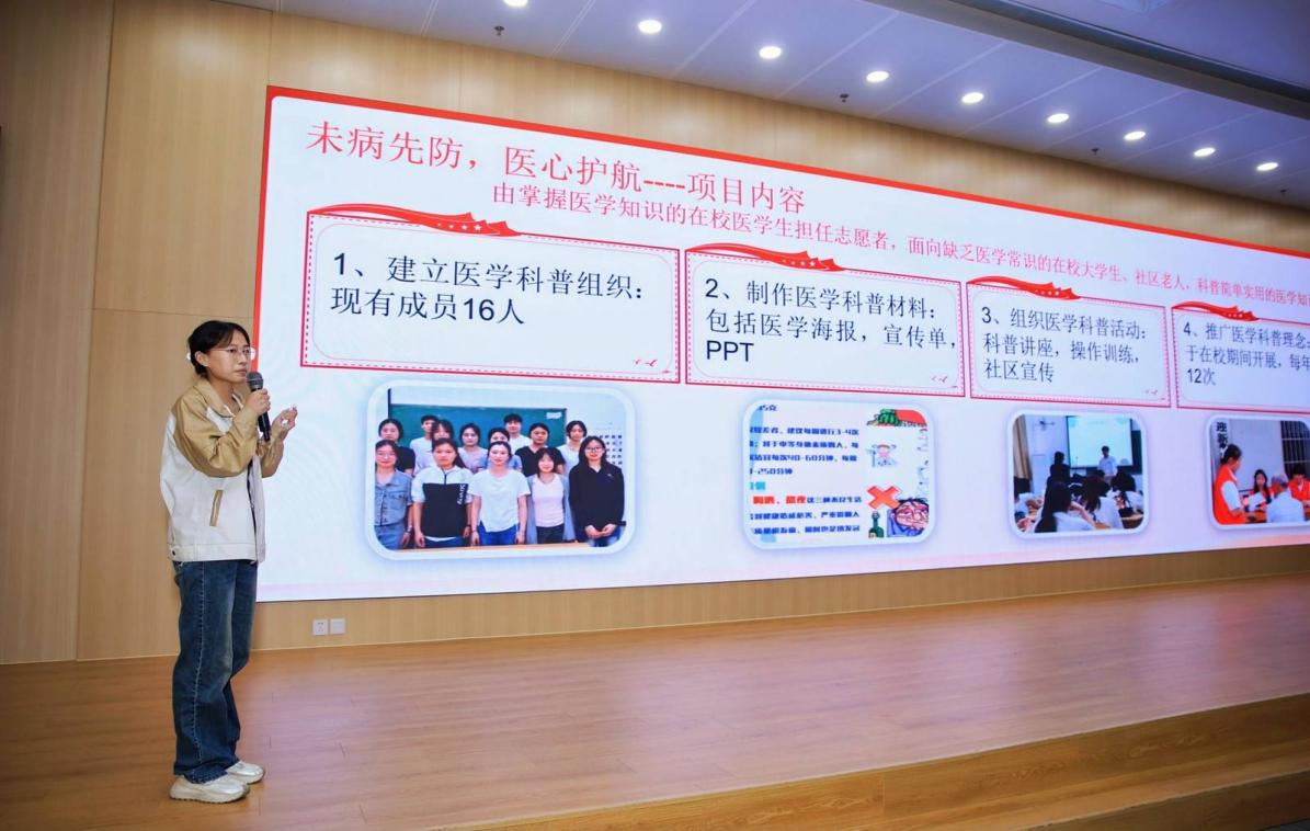 本次大赛汇集了来自全市各行各业的优秀志愿服务项目,竞争异常激烈。比赛现场,项目汇报人沈嘉欣同学以自信饱满的精神状态,向评委们清晰阐述了项目的基本内容和亮点所在。该项目紧密结合慢性病高发社会现象,设计了多元化慢性病预防服务方案,充分展现了医学生的专业素养和创新精神。