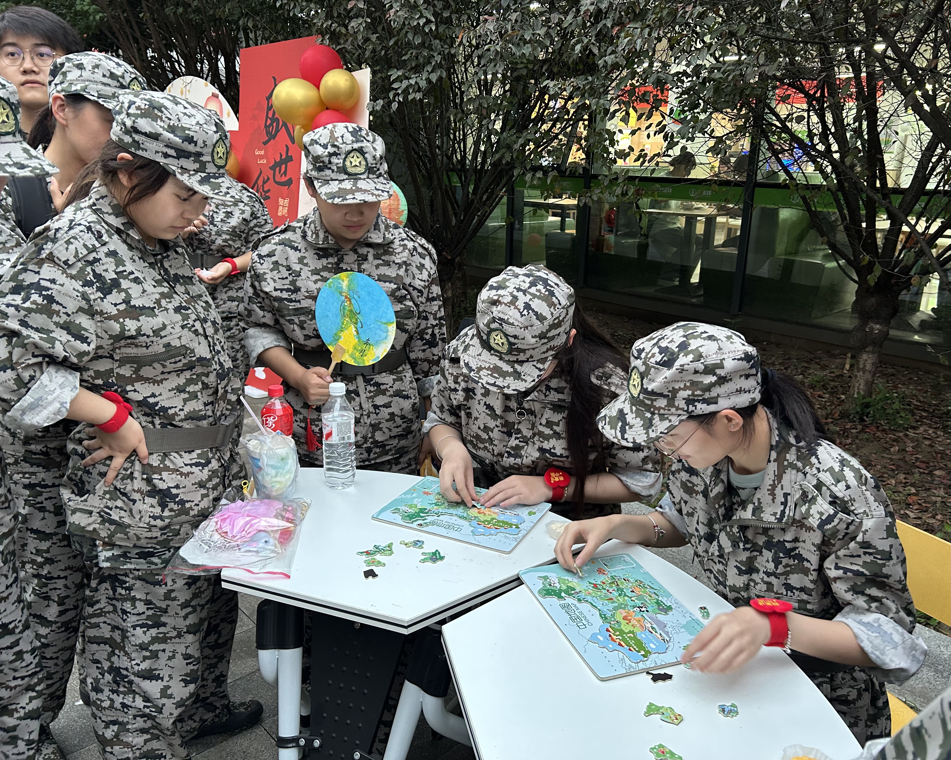 活动当日,现场热闹非凡,处处洋溢着欢声笑语,宛如一片欢乐的海洋。汇心湖校区活动现场设置了七大特色环节,将传统民俗与爱国元素巧妙融合。在“落笔签安康,双节庆华章”环节,同学们在签到卡上写下对家人的安康祝福与对祖国的美好祝愿,以笔墨传递深情;“猜谜赢盲盒,家国乐开花”环节,围绕中秋传统与国庆知识设计的灯谜,让同学们在趣味竞答中收获知识,答对者领取盲袋,答错也能获得国旗贴纸鼓励;“拼山河盛景,赛团圆心情”的拼图比赛,各组同学齐心协力拼搭“中秋月色下的中国地标”,在协作中感受祖国山河之美;“拼灯贺双节,手作忆团圆”与“漆扇映双辉,家国共欢归”环节,同学们自主拼接融合双节元素的灯笼、绘制扇面,用手作定格节日美好;“投壶寄心意,双节庆双喜”和“筷夹月饼趣,双节乐无极”环节,大家在传统游戏中比拼互动,累计积分兑换月饼、国庆徽章、中秋糕点等礼品。鼓山校区现场首先映入眼帘的是“星愿筑墙”环节。师生们纷纷驻足,拿起手中的素笺,认真思考着,将对未来的美好憧憬、对家国的深情祝福逐一书写下来;“投壶邀月”环节,参与者们手持箭矢,眼神专注而坚定,在规定距离外屏气凝神,准备投壶,每一次抬手、瞄准、投出,都凝聚着他们的期待和努力;而“中秋玉兔接福”“月是故乡明”“旋转钓兔子”“月饼大逃亡”等特色游戏区域,更是将中秋民俗与趣味竞技巧妙地融为一体。在“中秋玉兔接福”游戏中,师生们需要眼疾手快地抓住从空中落下的“福袋”,大家全神贯注,眼睛紧紧盯着“福袋”的下落轨迹,一旦时机成熟,便迅速出手,现场充满了紧张而刺激的氛围。“旋转钓兔子”游戏里,参与者们手持钓竿,努力钓起旋转的“兔子”,随着转盘的转动,他们的身体也跟着调整,但依然坚持不懈地尝试着。“月饼大逃亡”则要求参与者在规定区域内移动彩色的“月饼”,整个场区弥漫着浓浓的节日氛围。