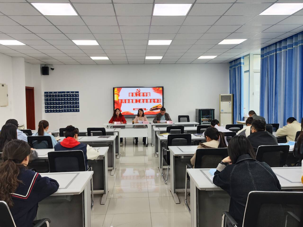 10月22日下午,建筑工程学院在建工楼304会议室召开了十月份教职工政治理论学习会议,该院党政班子及全体教职工参加会议,会议由该院党总支副书记(主持工作)丁怡琴主持。