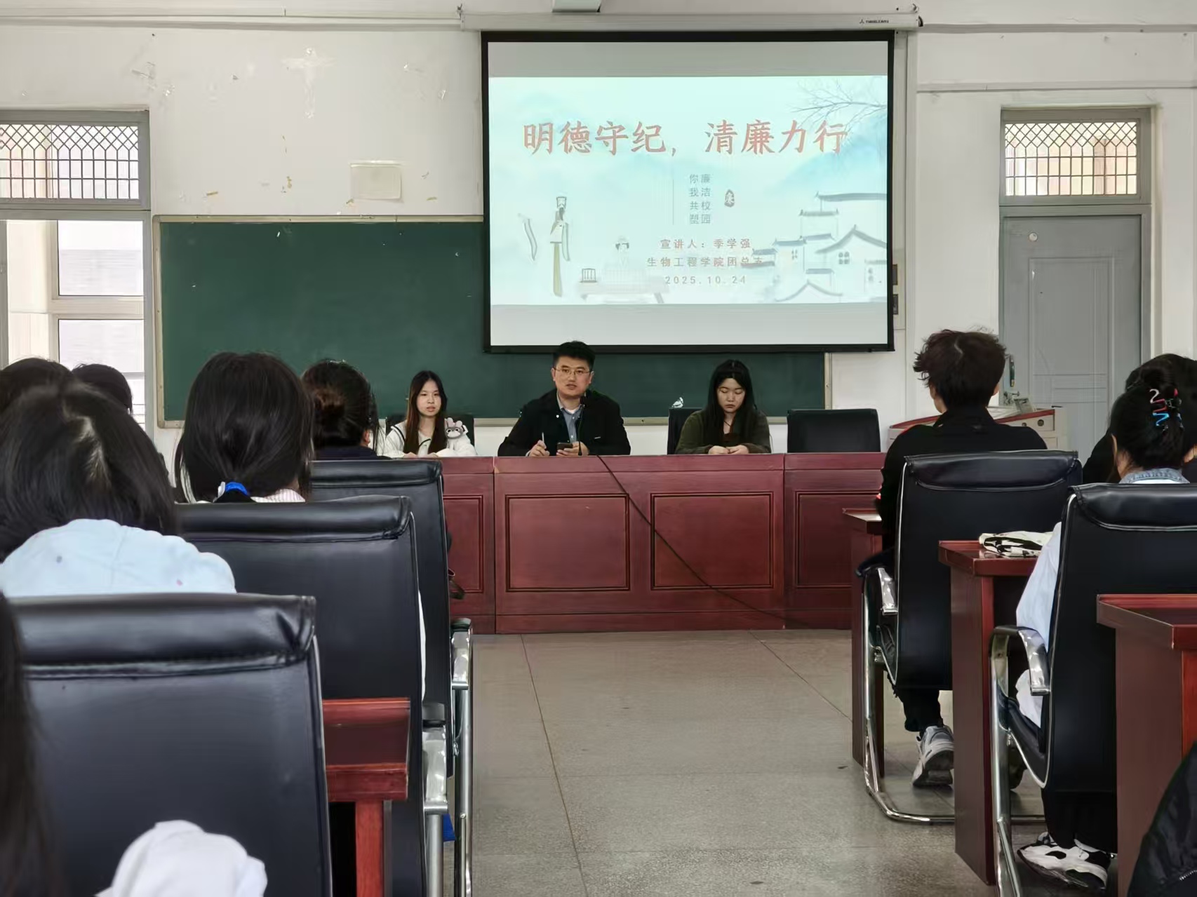 为深入推进廉洁文化建设,增强伟德官网学生的廉洁意识和自律精神,生物工程学院团总支于10月24日在生化楼A305会议室开展了“明德守纪 清廉力行”主题团课。本次团课由该院团总支书记季学强老师主讲,所有2025年下半年入团积极分子参加。