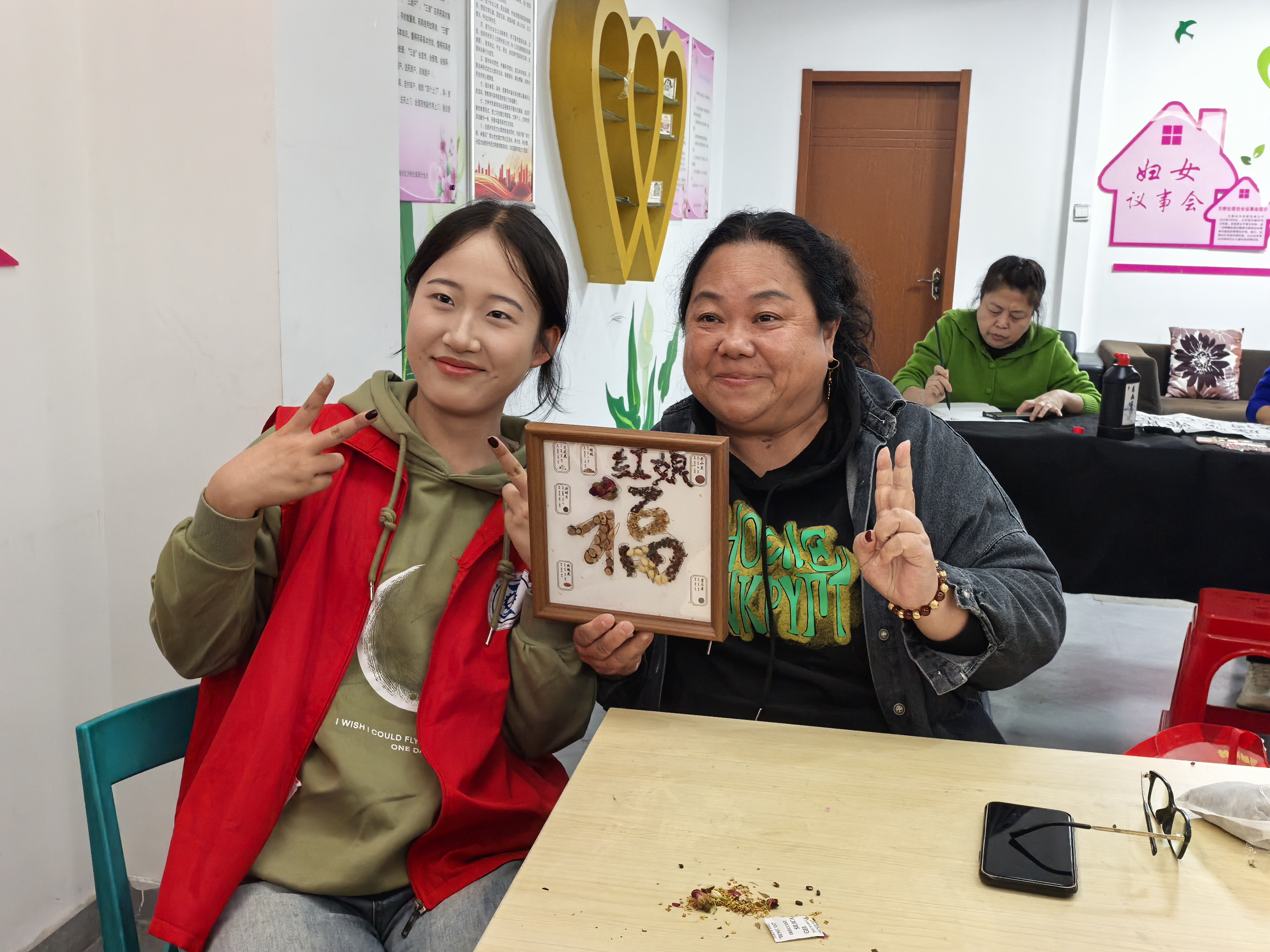 活动现场,志愿者与老人们一起动手制作非遗手工——中草药香氛画。志愿者们耐心讲解制作步骤,协助老人们挑选药材、搭配色彩、粘贴构图。有的老人小心翼翼地将艾草、菊花等中草药粘贴在画布上,不时询问志愿者是否贴得整齐;有的老人与志愿者一起讨论画面的意境,笑语盈盈,气氛温馨。另一边,几位热爱书法的老人挥毫泼墨,神情专注,一笔一画尽显功底。志愿者在一旁铺纸研墨,不时发出赞叹。一幅幅“福寿安康”、“重阳敬老”的毛笔字,不仅展现了老人们的精神风貌,也将传统文化的韵味传递给了在场的每一个人。