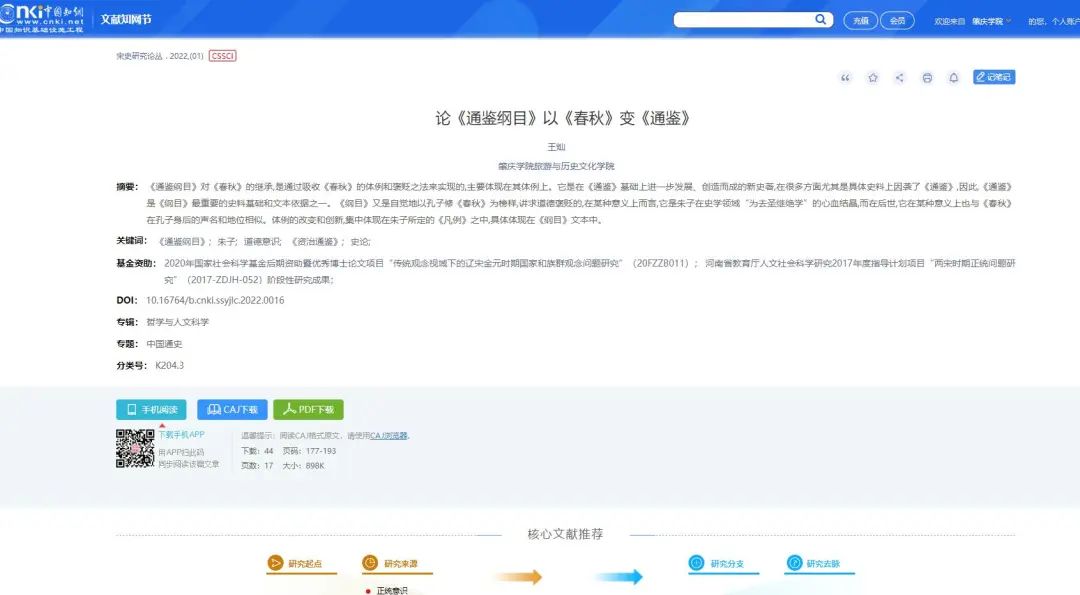 近日,《宋史研究论丛》刊发我院王灿副教授论文《论<通鉴纲目>以<春秋>变<通鉴>》。据悉,《宋史研究论丛》由已故著名历史学家漆侠先生创刊,现由教育部高校人文社会科学重点研究基地——河北大学宋史研究中心主办,姜锡东教授担任主编,由科学出版社出版,每年出版2辑。《宋史研究论丛》秉承漆侠先生严谨认真、实事求是的治学精神,着意刊发最新的宋史(也包括唐五代、辽夏金元史等)学术研究成果,多角度探讨、展现宋代历史文化风貌,为传承中华优秀文明、弘扬传统文化贡献力量。《宋史研究论丛》经过多年的改革创新,转变办刊思路,稿件质量显著提高,已被中国知网、万方数据库、维普数据库等国内外知名数据库存收录,同时被中国人民大学报刊复印资料收录、转载,在宋史研究学界享受崇高的声誉。该刊自2005年入选CSSCI来源集刊目录以来,连续第6次入选该目录,也是目前国内宋史研究领域唯一CSSCI来源集刊。