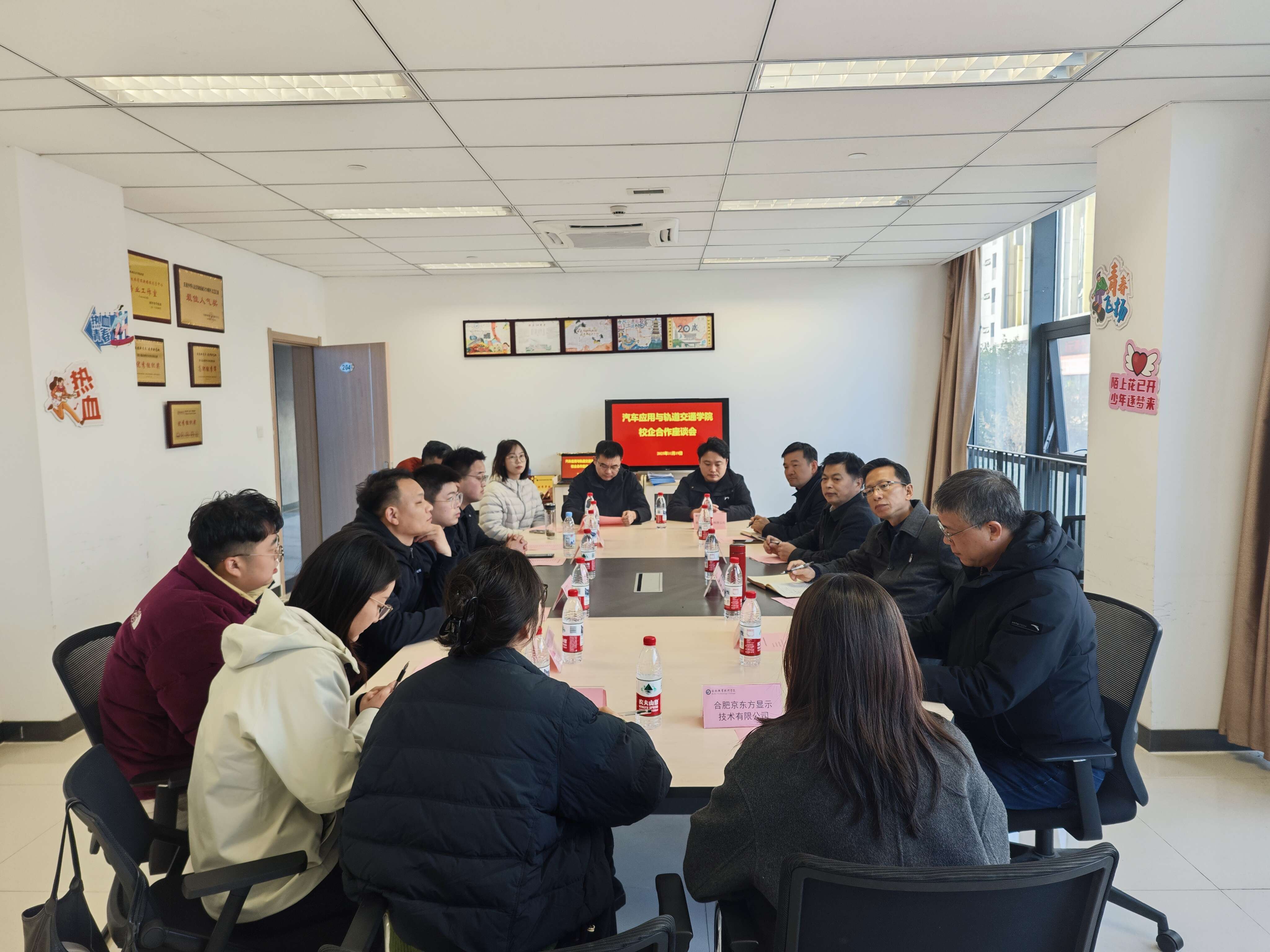 11月19日下午,汽车应用与轨道交通学院组织开展访企拓岗专项行动,召开校企合作座谈会,进一步深化产教融合、推动协同育人。副校长王海,汽车应用与轨道交通学院党总支副书记尹仕果、副院长许鹏、副院长劳志鸿等,与来自合肥国轩电池科技公司、格力电器(合肥)有限公司、合肥京东方显示技术有限公司、合肥维信诺科技有限公司、合肥海尔滚筒洗衣机有限公司、安徽卓泰保安服务有限公司等10家企业代表齐聚一堂,围绕人才培养、实习就业、专业建设等议题展开深入交流。