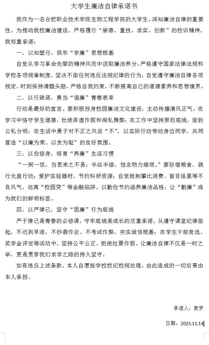 签署“大学生廉洁自律承诺书”。为引导青年学子诚实守信、履行诺言,自立自强,增强廉洁自律意识,传播正能量并营造良好的校园廉洁文化氛围。近期,该院各班级组织学生线上和线下签署“大学生廉洁自律承诺书”。廉洁之德,如明灯照亮前路,签署廉洁承诺书能让学生自发地重视廉洁,增强自身的廉洁意识,使生物学子们能够在实际行动中传承廉洁,践行廉洁,发扬廉洁。