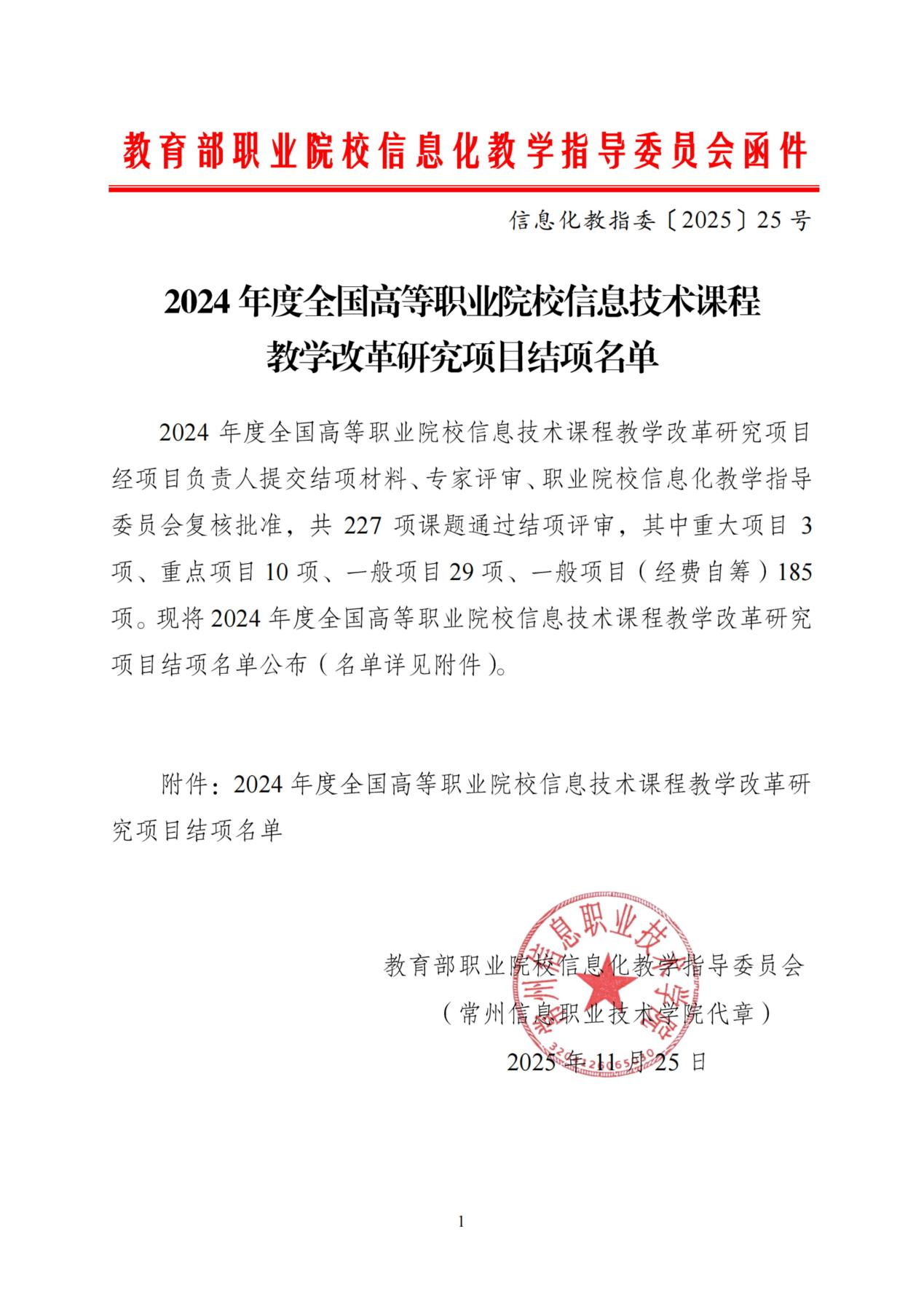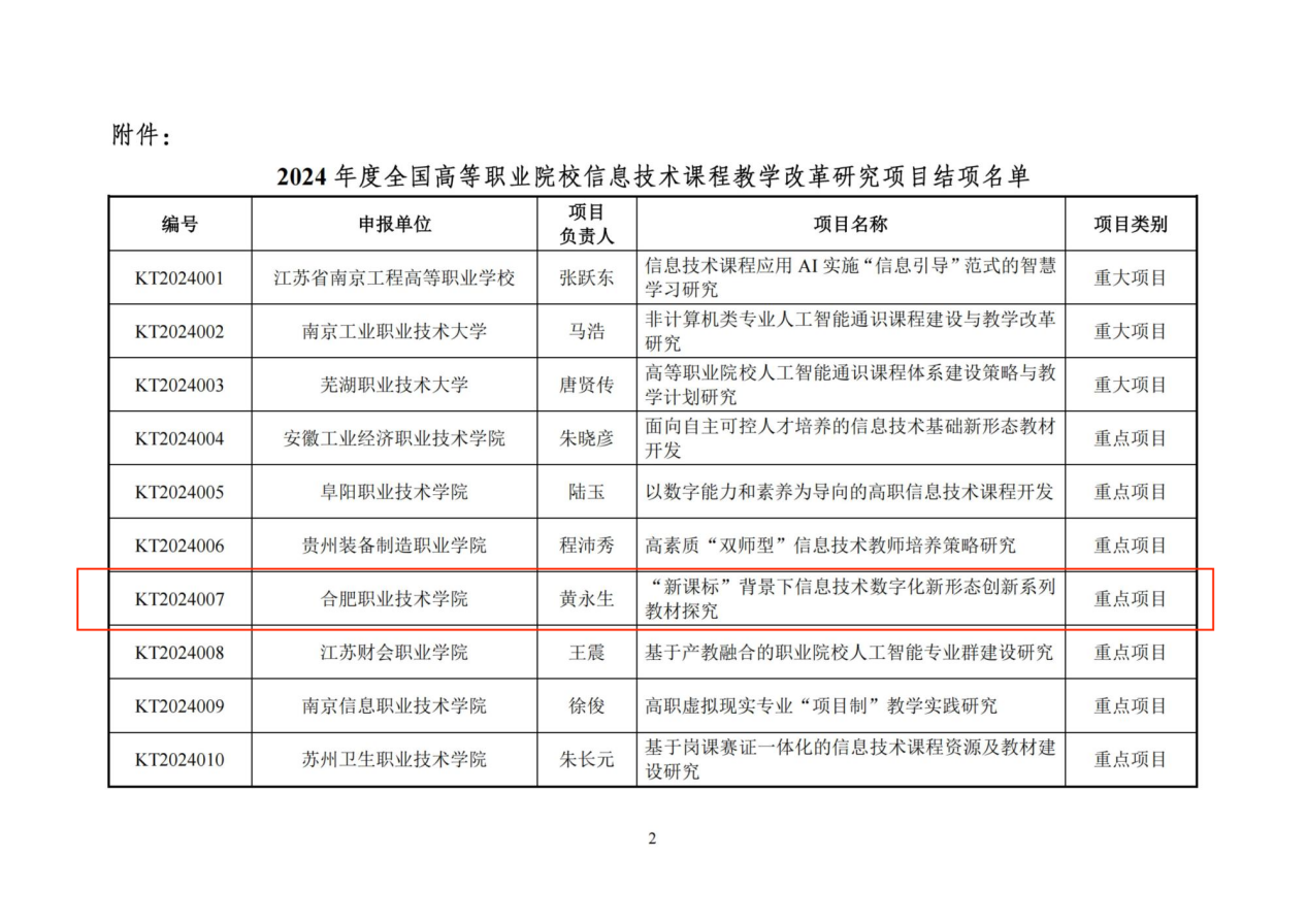 近日,教育部职业院校信息化教学指导委员会公布了2024年度全国高等职业院校信息技术课程教学改革研究项目结项名单。伟德官网申报的重点项目《“新课标”背景下信息技术数字化新形态创新系列教材探究》(项目编号:KT2024007)顺利通过结项评审。