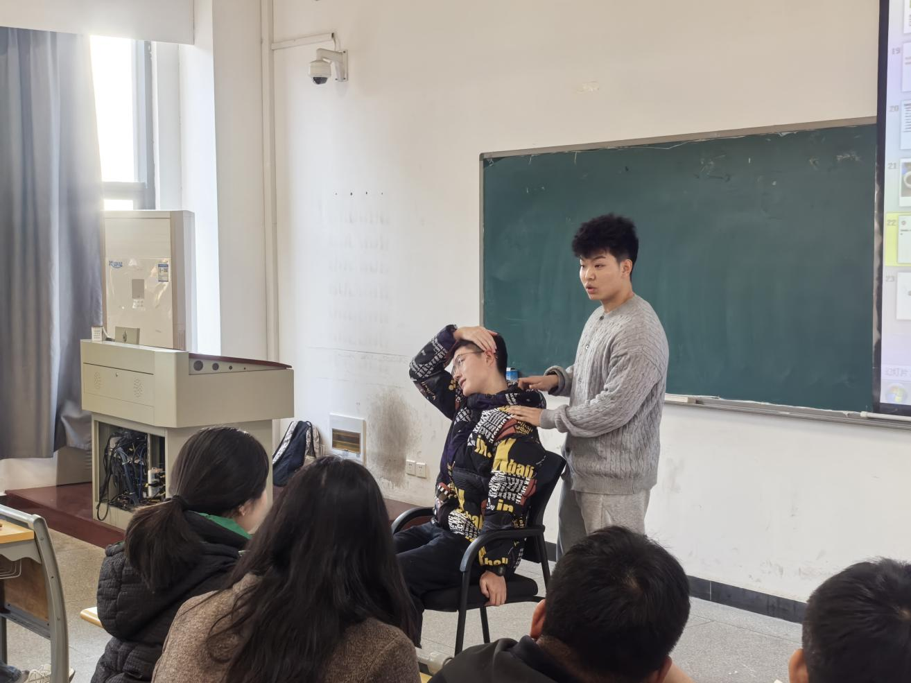 互动实践环节成为本次讲座的一大亮点。李梦祥同学率先示范斜方肌专业拉伸技巧,现场指导同学们通过颈部侧屈、肩胛收缩等针对性动作放松肌肉,并逐一纠正大家练习中出现的“发力过猛、姿势歪斜”等常见错误,同时提醒同学们每个动作需保持15-30秒,才能达到最佳放松效果。同学们积极起身跟随练习,在亲身体验与实时指导中,快速掌握了正确的动作要领。