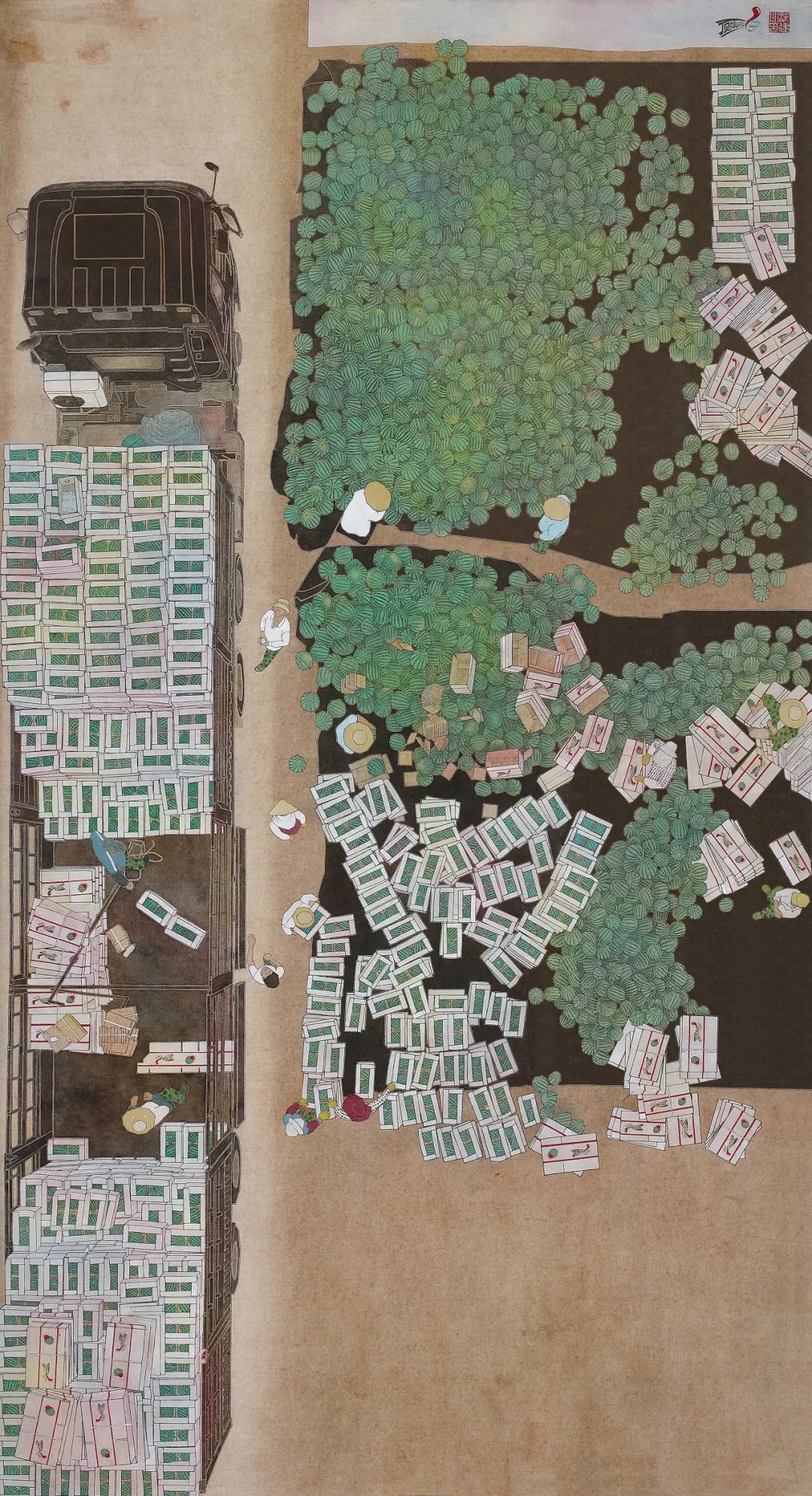 涂建坤《瓜田香里说丰年》,纸本设色,96×177cm