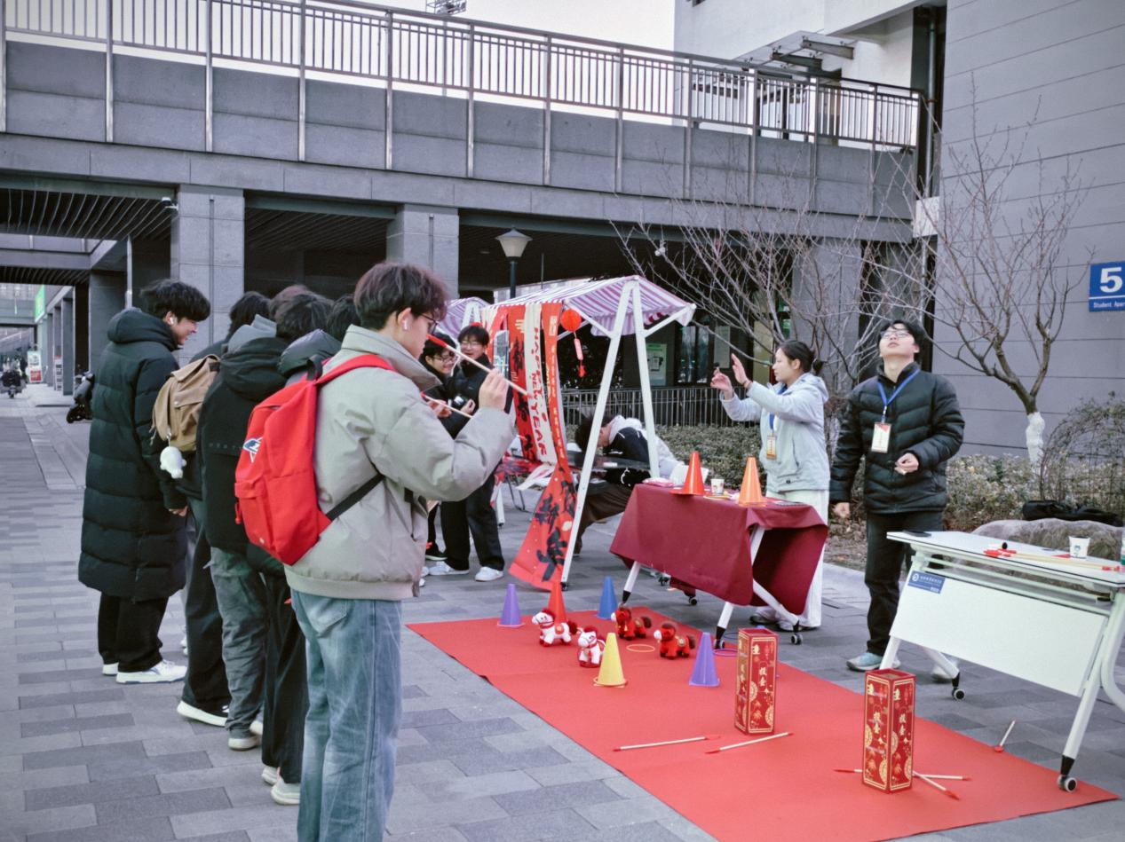 打卡拍照区的签到墙前,同学们纷纷抽取新年祝福、写下美好愿望并合影留念;“百福墙”上,一张张手写福字汇聚成满满的新年期许,完成活动即可收获专属拓印福字;民俗体验区内,同学们或挥毫泼墨创作手绘春联,或专注拓印大幅福字,或挑选材料包制作香囊、编织中国结,在动手实践中感受传统技艺的魅力;糖画展车前人头攒动,大家亲手绘制的创意糖画成为最甜蜜的节日记忆;迎新游戏区的“圈福气”套圈、“投福字”投壶活动趣味十足,同学们凭借技巧与运气赢取更多拓印福字,现场喝彩声、欢呼声不断。