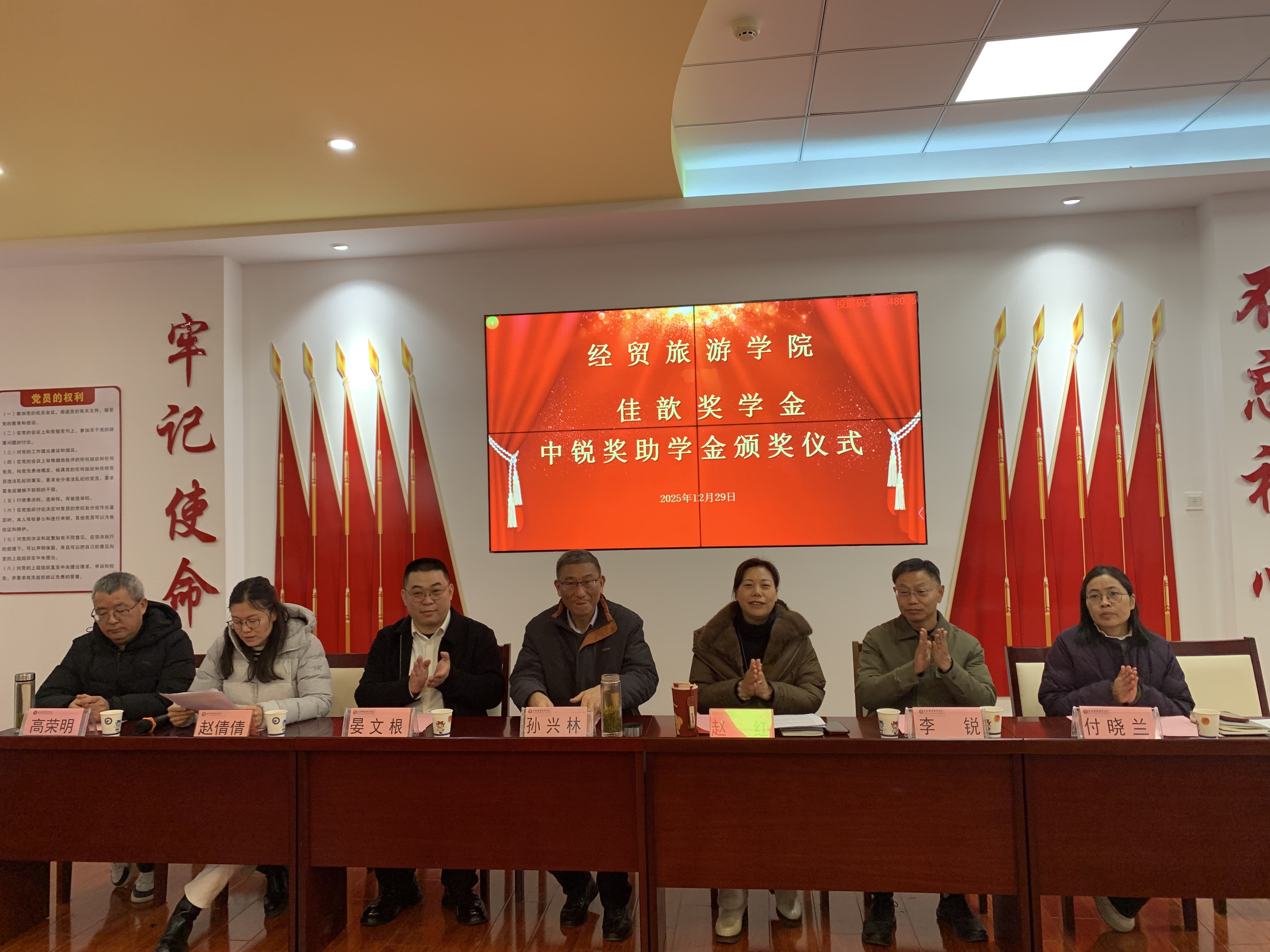 为表彰先进、激励学子勤奋进取,营造优良学风,12月29日下午,经贸旅游学院2025年佳歆奖学金、中锐奖助学金颁奖仪式在该院党性体验馆举行。上海佳歆房地产投资顾问有限公司企业代表晏文根总经理一行,安徽中锐税务师事务所有限责任公司李锐董事长,伟德官网关工委主任孙兴林、经贸旅游学院院长赵红、党总支副书记赵倩倩、副院长付晓兰、综合办主任高荣明,辅导员代表,学生干部代表以及获奖学生出席本次仪式,仪式由赵倩倩主持。