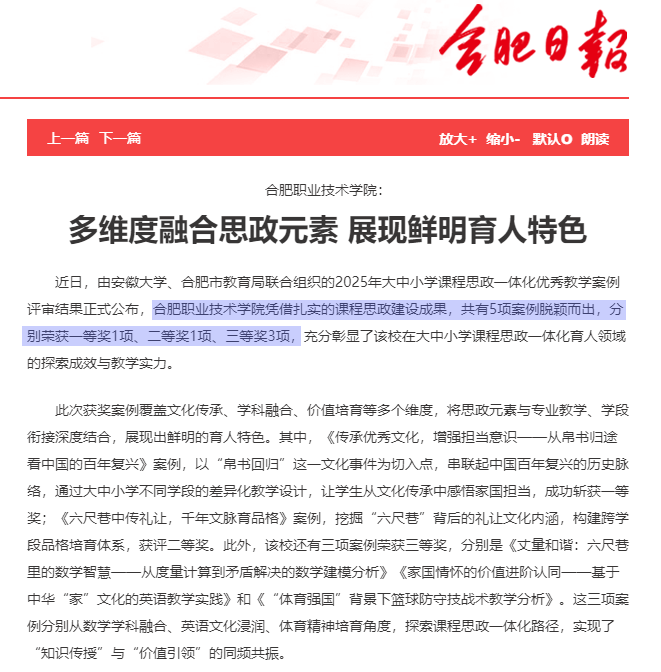 该院牵头推进建设巢湖市、合肥市(新站区)大中小学思政课一体化共同体,2025年共开展7场活动,市级研讨与展示活动3场。2025年在安徽大学、合肥市教育局联合组织的大中小学课程思政一体化优秀教学案例评审活动中分别荣获一等奖1项、二等奖1项、三等奖3项。安徽省2025年中小学教育教学论文暨大中小学思政课一体化建设专题论文评选活动中荣获二等奖1项、三等奖1项。