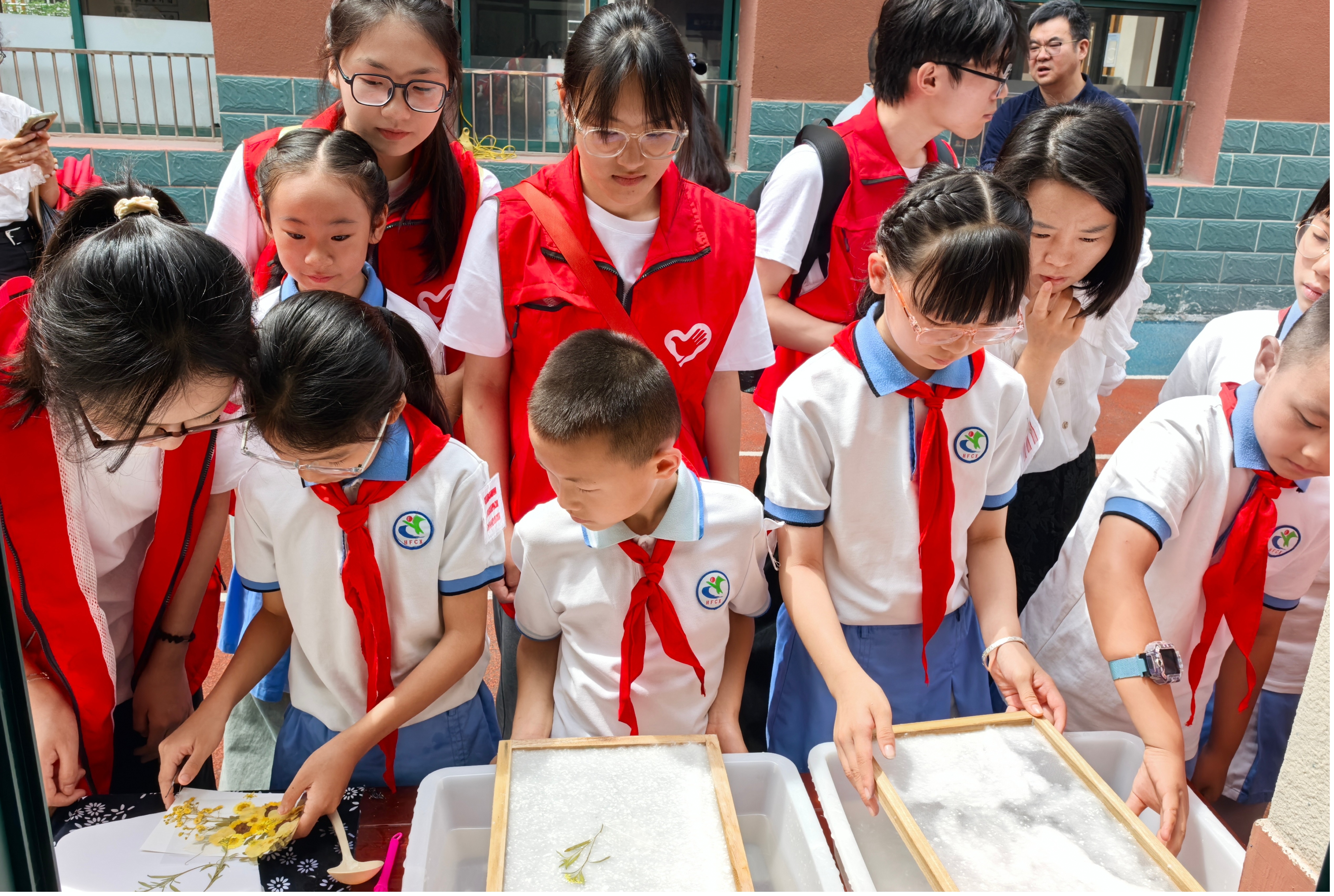 6月25日学生在合肥市滁州路小学体验漆扇、扎染、巢湖纸笺加工技艺等非遗工艺