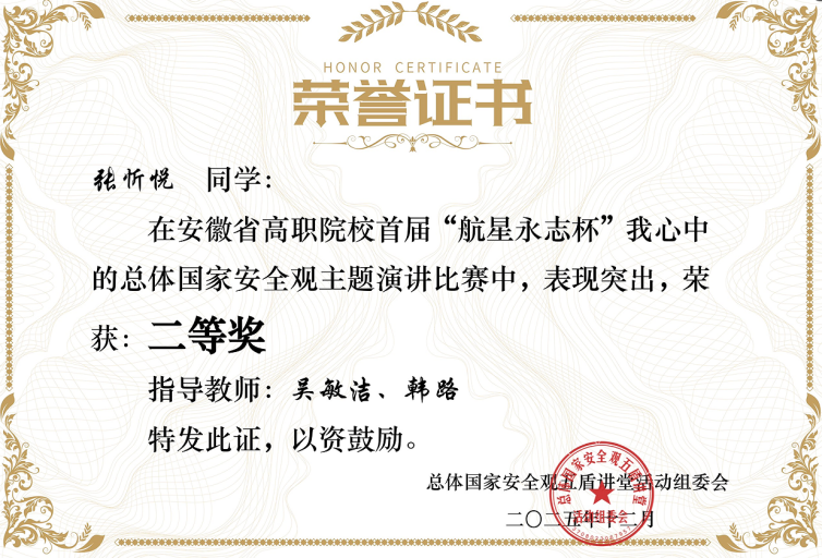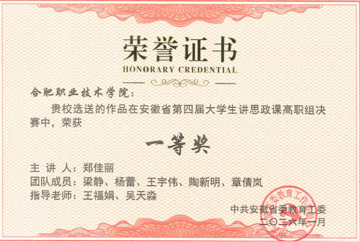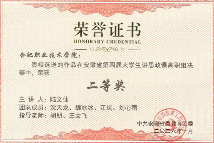 在安徽省第四届“大学生讲思政课”比赛中,斩获省赛一等奖1项、二等奖1项,4位老师荣获“优秀指导老师”。在安徽省高职院校首届“航星永志杯”总体国家安全观主题演讲比赛中,斩获二等奖1项,2位老师荣获“优秀指导教师”称号,伟德官网被大赛组委会授予“最佳组织奖”。该院教师韩路代表合肥第二开放大学获得安徽开放大学首届教师教学创新暨课程思政教学大赛决赛一等奖。该院教师陈力参加2025年新站区高校思想政治理论课教学联盟思政课教学展示与观摩活动荣获三等奖。上半年组建2支队伍参与2025年度校级教学能力大赛,下半年组建4支队伍备赛2026年度校赛,最终有3支队伍进入校级决赛。