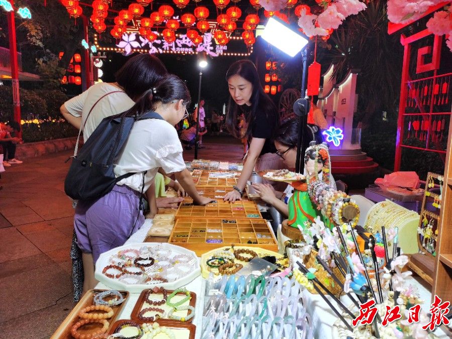 盛夏晚上,端州区星湖西堤褪去了白天的燥热,开启了城市夜生活浓浓的烟火气。与传统夜市不同的是,星湖紫荆西堤文创街区的业态不止于吃喝,还包括了传统文化体验、手工艺品制作、环星湖游等等。
