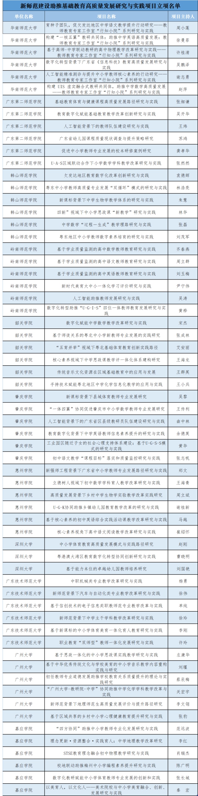 日前,广东省教育厅公示2023年新师范建设助推基础教育高质量发展研究与实践项目立项名单。经高校遴选、资格审查、专家审定等程序,广东11所高校的63个项目获立项支持,项目涵盖幼儿园、小学、中学等不同学段,涉及教师队伍建设、课程教学改革、思政课建设、教育数字化转型等领域。