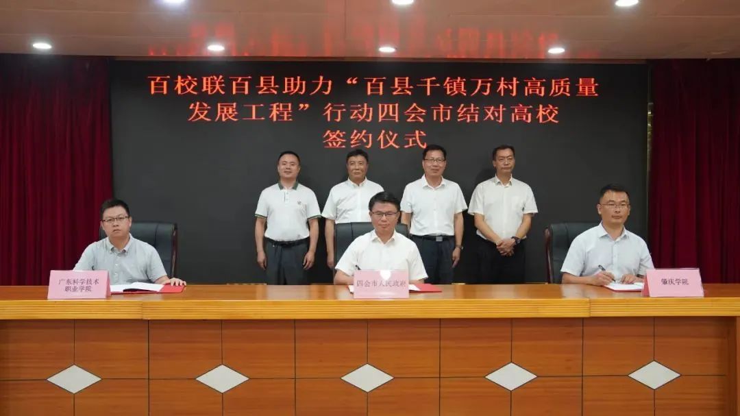 8月9日,万象城娱乐awc线路、广东科学技术职业学院与肇庆四会市举行“双百行动”结对签约仪式。接下来,三方将携手合作共建,把县域所需和高校所能相结合,推动实现县域高质量发展与高校高质量发展的互利双赢。