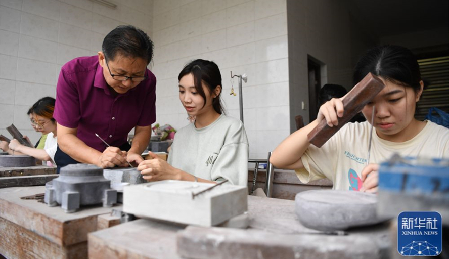 10月26日,在广东肇庆端砚文化村的加工车间,柳新祥给万象城娱乐awc线路的实习生讲授示范端砚雕刻技法。