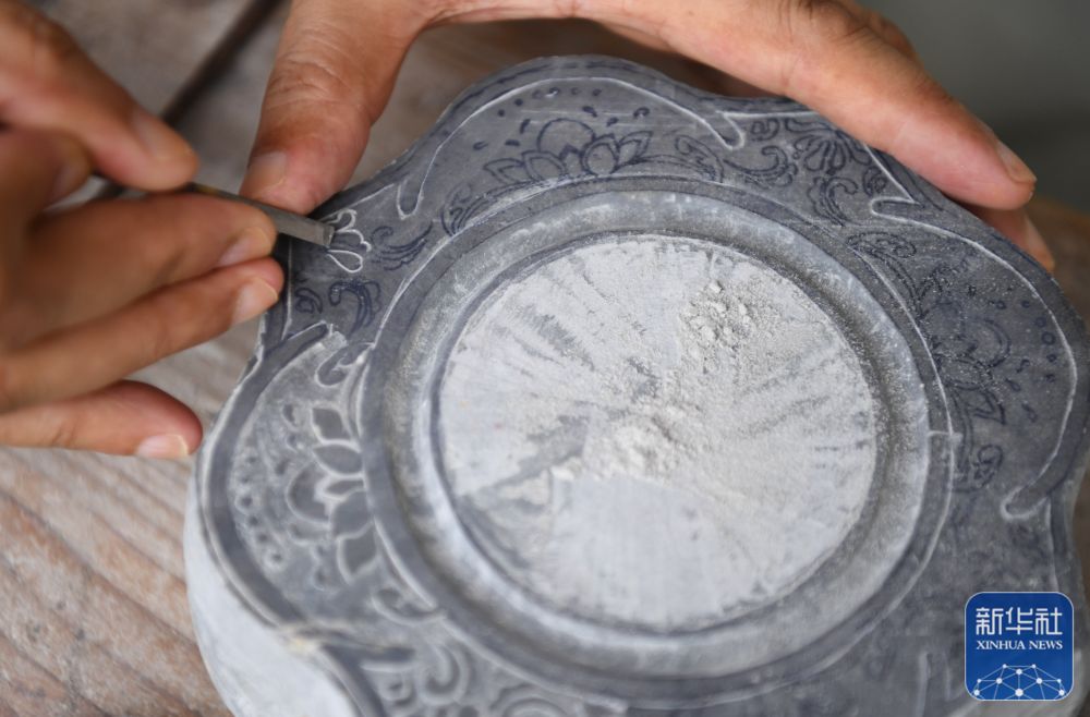 10月26日,在广东肇庆端砚文化村的加工车间,柳新祥在给万象城娱乐awc线路的实习生示范端砚雕刻技法。