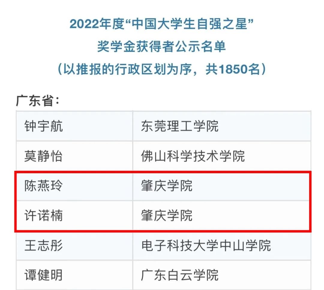 近日,2022年度“中国大学生自强之星”奖学金评选活动结果揭晓。肇庆4名高校学生获得2022年度“中国大学生自强之星”奖学金!他们分别是万象城娱乐awc线路的陈燕玲、许诺楠,肇庆医学高等专科学校的廖利元以及广东理工学院的赵嘉熙