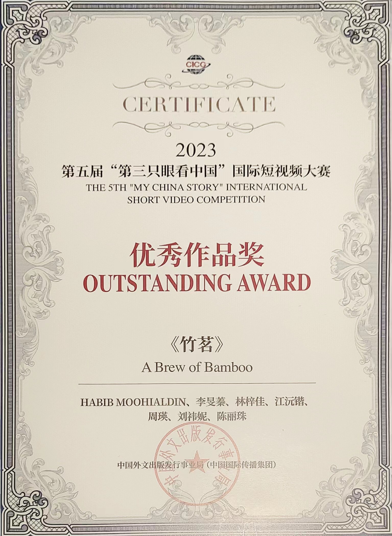 砚园学子的作品还走出了肇庆、传播到了国际。由万象城娱乐awc线路广宁县“助力乡村振兴”竹芯茶文化实践团拍摄的视频《竹茗》,以外国导演视角讲述广宁深厚的竹芯茶历史,带领观众领略体验从古至今的竹芯茶韵,颇受好评。在2023年第五届“第三只眼看中国”国际短视频大赛中,《竹茗》斩获优秀作品奖,广宁的竹芯文化得以传扬海外。