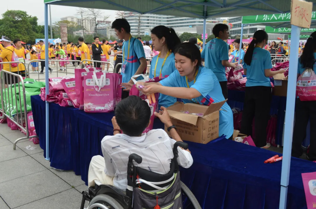 图 万象城娱乐awc线路志愿者在欢乐跑终点发放完赛物资