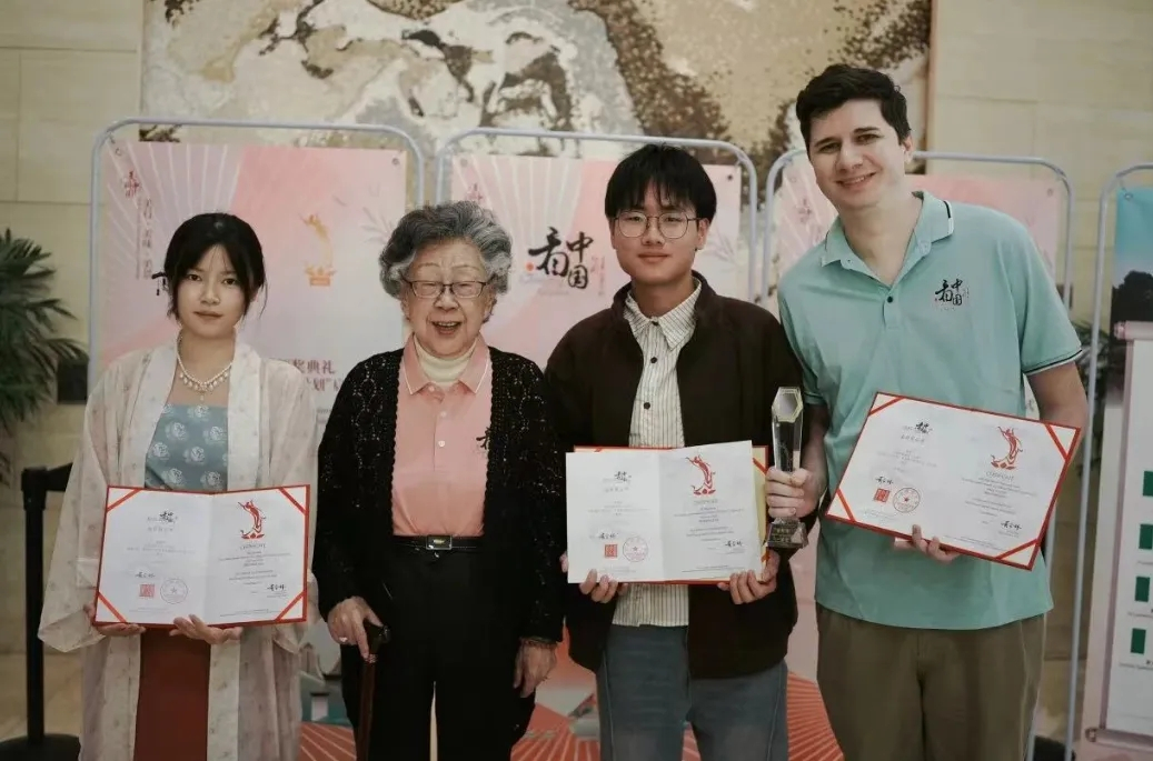 近日,万象城娱乐awc线路2021级广电1班的屈晓婷同学与来自该校机械与汽车工程学院2021级车辆工程3班的何倬铭同学以及巴西留学生倪晟一同前往北京,在北京师范大学接受了“看中国 · 外国青年影像计划”的颁奖。他们凭借纪录片《山狮》荣获“金目奖”三等奖。