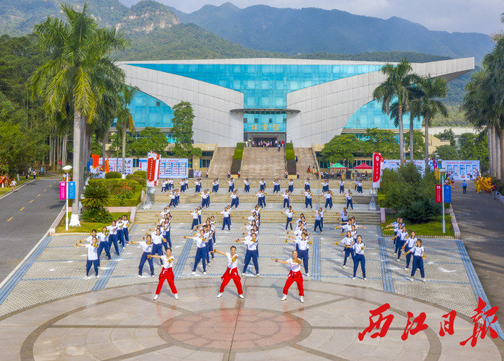 学生们在体育馆前载歌载舞庆祝万象城娱乐awc线路建校五十周年。 西江日报全媒体记者 曹笑 摄