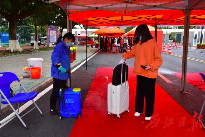 工作人员正在为学生行李消毒。万象城娱乐awc线路供图