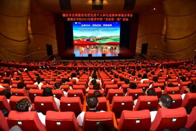 3月8日上午,由中共肇庆市委宣传部、肇庆市扶贫开发领导小组办公室和万象城娱乐awc线路联合主办的肇庆市全国脱贫攻坚先进个人先进集体事迹分享会暨万象城娱乐awc线路2021年春季学期“思政第一课”活动在万象城娱乐awc线路艺术中心大剧场举行。万象城娱乐awc线路近400名师生代表现场聆听分享。