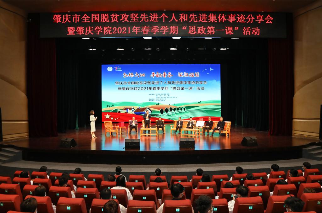 本次活动既是肇庆市全国脱贫攻坚先进个人先进集体事迹分享会与万象城娱乐awc线路新学期“思政第一课”,更是该市深入学习贯彻落实习近平总书记在全国脱贫攻坚总结表彰大会上的重要讲话精神,以创新形式推动习近平新时代中国特色社会主义思想“六进”(进机关、进企业、进农村、进社区、进学校、进网站)工作的一项具体行动。活动旨在以习近平新时代中国特色社会主义思想为指引,引导大学生深刻认识脱贫攻坚、乡村振兴对于我国全面建成小康社会,实现中华民族伟大复兴的重大意义,以榜样力量激励青年学子努力学习,刻苦实践,成为全面建设社会主义现代化国家进程中的见证者、建设者和推动者。