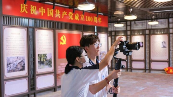 另一边,端州叶挺独立团团部旧址(阅江楼)党史学习实践团到达叶挺独立团旧址陈列馆。一下车,阅江楼重檐翘脚楼高三层之势映入眼帘。随后,成员们走进馆内,认真学习并记录里面陈列的文物、历史照片、雕塑、绘画、模型、电视专题片等,感受叶挺独立团的战斗历程。据实践团成员现场发现,馆内配有讲解员和智能机器人,给游客提供良好的观赏、学习体验,为游客近距离感受叶挺独立团创建辉煌历史以及爱国爱民、勇打头阵、敢打硬战,不怕牺牲的革命精神提供更好条件。据实践团观察发现,开馆后的阅江楼游客较多,不少外地游客以及其他学校的实践团队等前来学习参观。据悉,为拍摄出西江河的浩瀚和阅江楼历史的光辉,实践团队队员们精益求精,从上午九点到下午一点,连续拍摄5个小时,累计拍摄素材70多G。