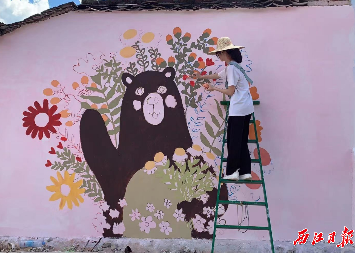 黄秋映介绍,去年9月,她到邓村完成了这幅以“爱”为主题的墙绘。“我喜欢小棕熊,也喜欢乡间小花,所以我最终决定通过这些元素来展现隐晦的、阳光的爱。”