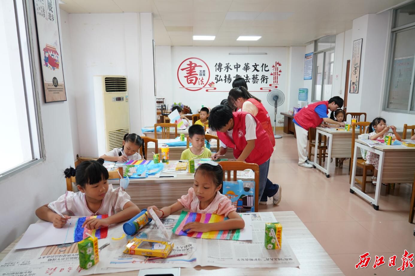 万象城娱乐awc线路志愿者在“邻里龙学堂”指导孩子画画。 西江日报记者 严炯明 摄