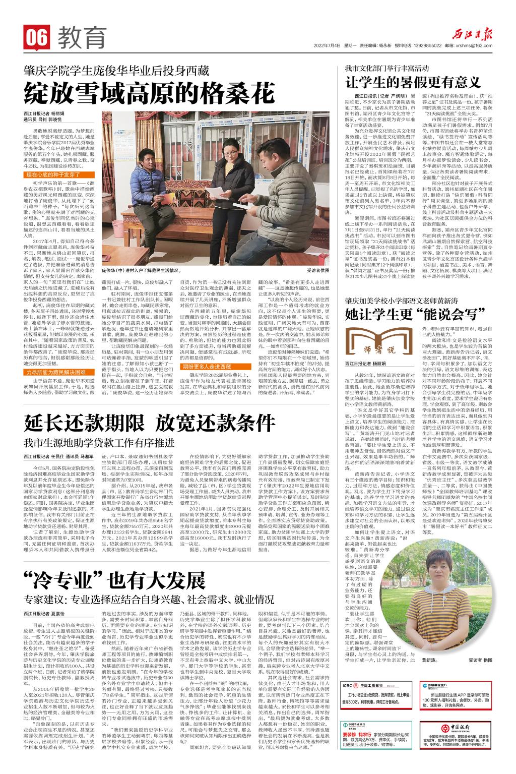 “以我的个人经历来说,前往西部工作是一个值得考虑的就业方向,这不仅是个人谋生的需要,更是爱国情怀的体现。”庞俊华说,实践证明,广阔天地大有可为,西部就是这样的广阔天地。让她欣慰的是,在一次次的交流中,她从师弟师妹的眼中看到那种向往着西藏的目光,一如当年的自己。