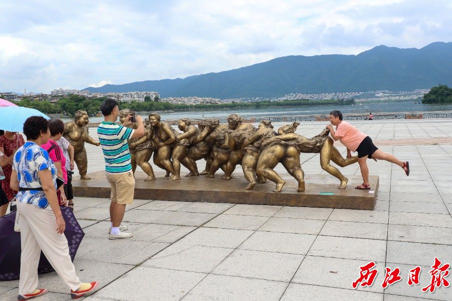 市民模仿动作,与雕塑合影。 西江日报记者 曹笑 摄、