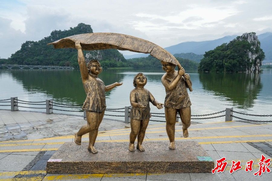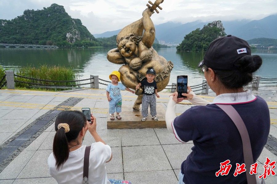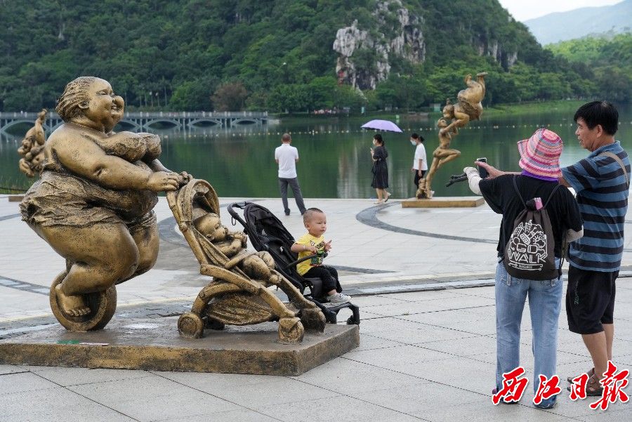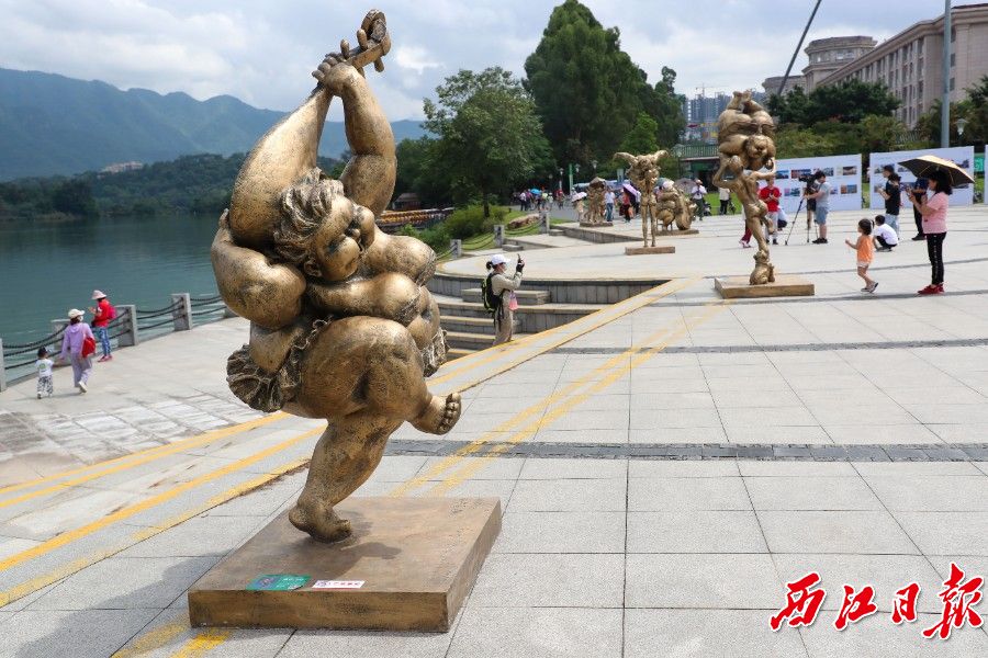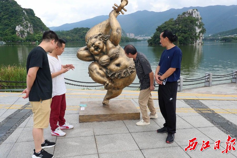 市民与雕塑互动。西江日报记者 曹笑 摄