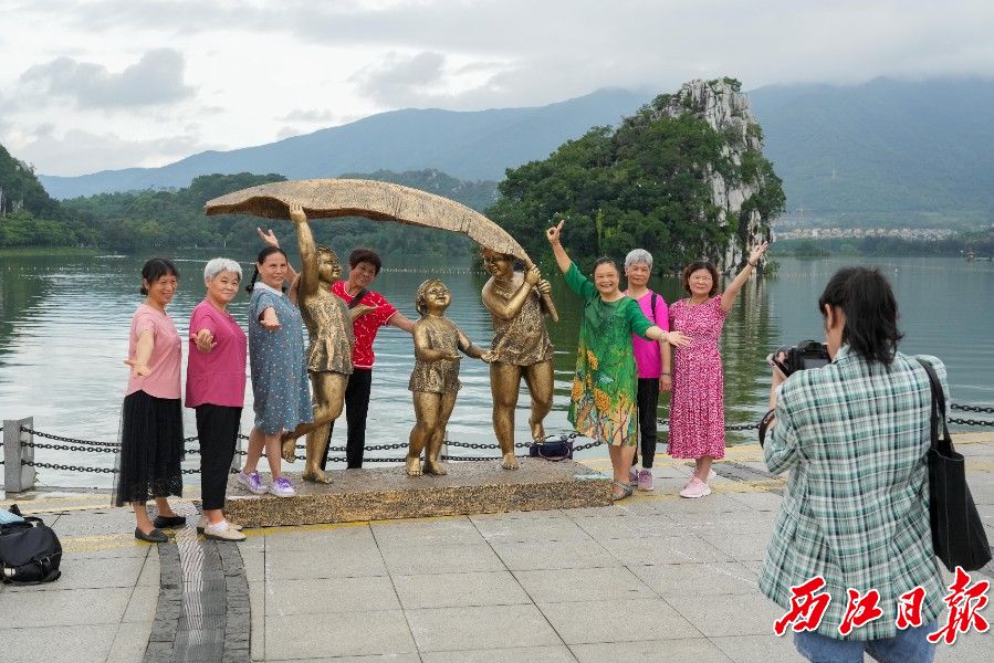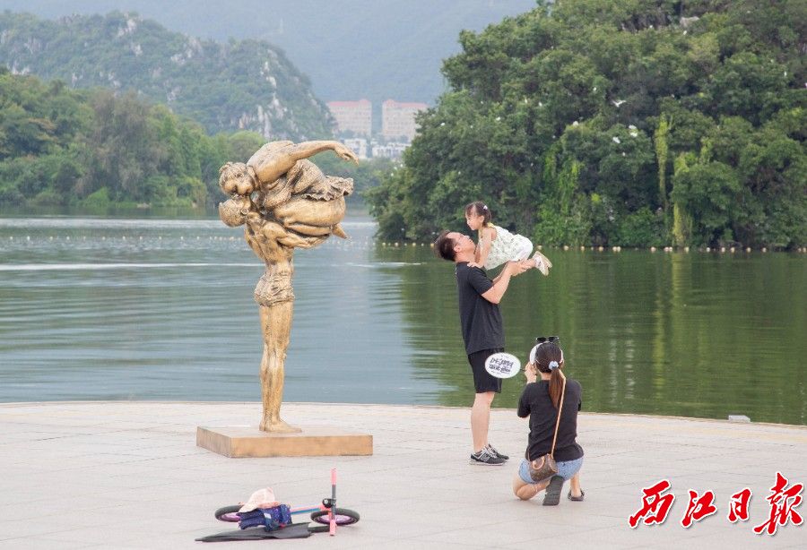 艺术与自然相映成趣,市民与雕塑欢乐合影。 西江日报记者 曹笑 摄