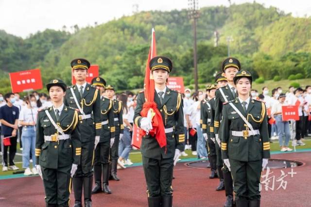香港科技大学(广州)举行首次国庆升旗仪式,师生员工代表整齐列队在室外体育场,一同为祖国母亲献上祝福。